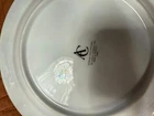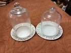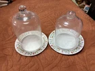 Two Ashley Overseas Eternal Love Pattern Plates with Glass Domes. Each plate measures 8" in diameter. One dome is just over 7" tall (5.5" usable height) and 5" in diameter. The larger dome is about 8.5" tall (6.5" usable height) and 5" in diameter.