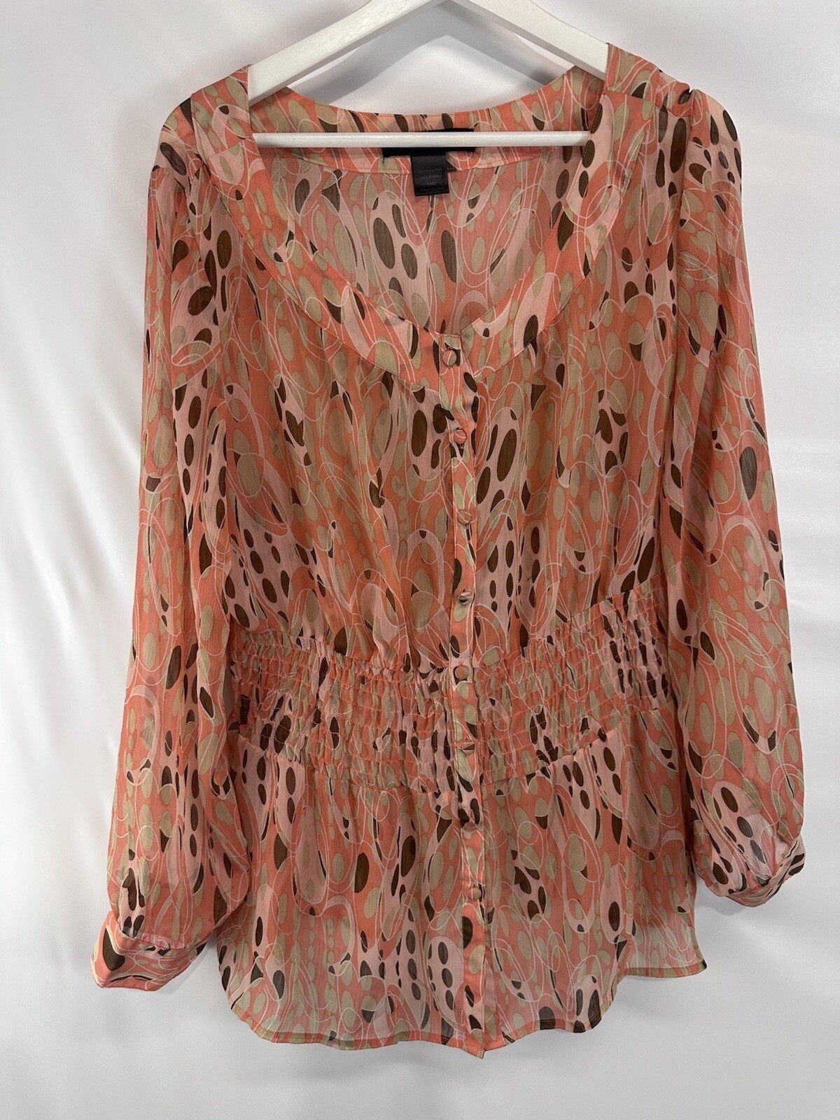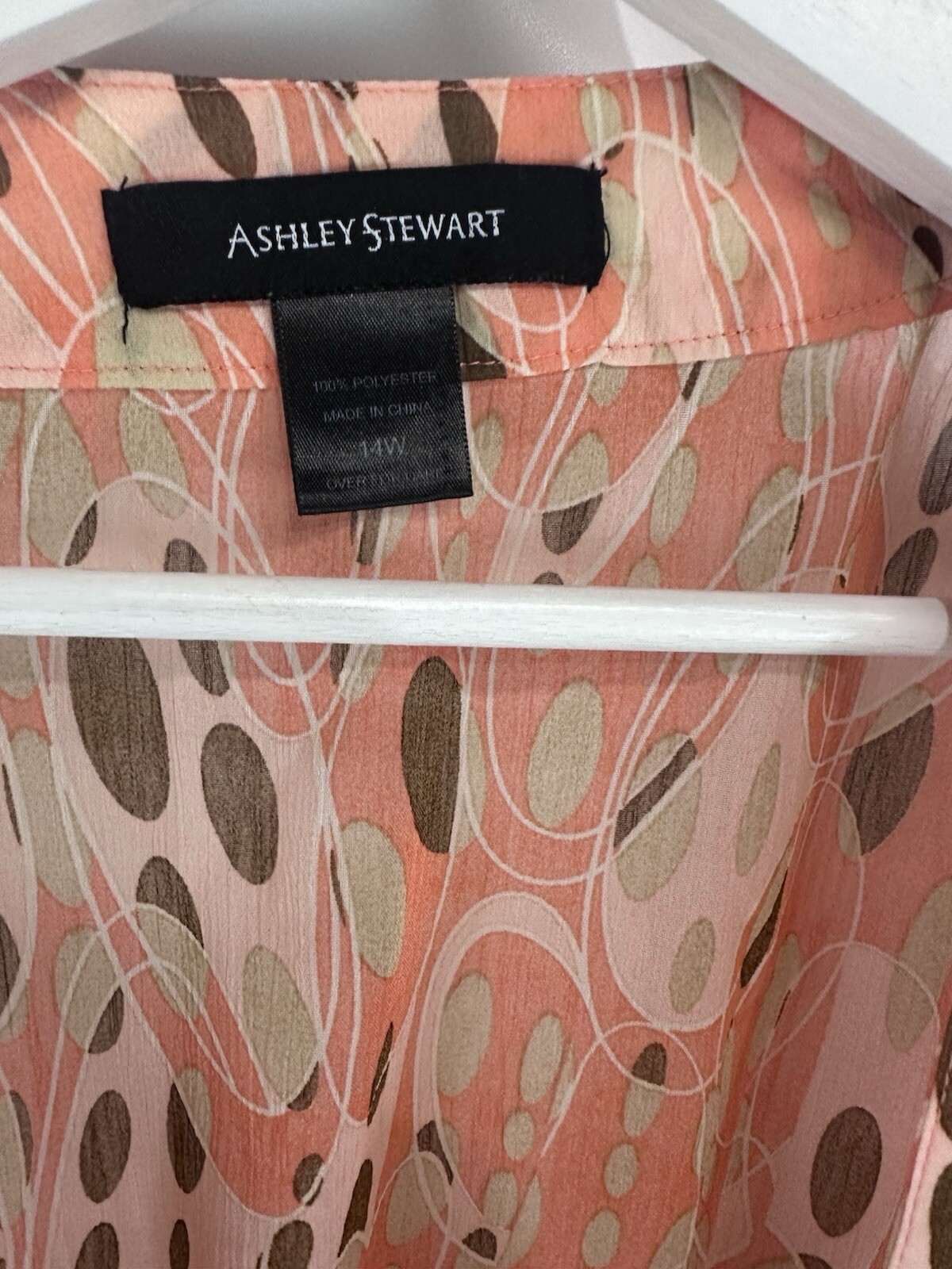 MEASUREMENTS length-31” bust-24.5” Elevate your wardrobe with the Ashley Stewart Long Sleeve Blouse, a versatile piece that brings a touch of elegance to any outfit. Sized at a comfortable 14W, this blouse features a geometric pattern in a lively multicolor palette, complemented by a classic round neckline and casual long sleeves. The smocked accents add a subtle texture that's both stylish and flattering. Crafted from lightweight chiffon material, this top ensures a smooth and comfortable fit, perfect for a range of occasions from business meetings to casual outings. It's easy to care for with machine washable convenience, making it a practical addition to your collection. Whether you're dressing for fall, spring, or summer, this blouse is a timeless choice that promises to keep your style on point.