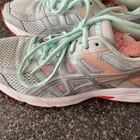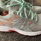 Asics women's 8.5 CORAL AND GRAY great condition Rearfoot GEL technology cushioning: Improves impact absorption and creates a softer feeling at footstrike Jacquard mesh upper: Improves airflow OrthoLite sockliner: Offers excellent step-in comfort Flex grooves in the outsole: Improve flexibility Synthetic stitching on the overlays: Improves support