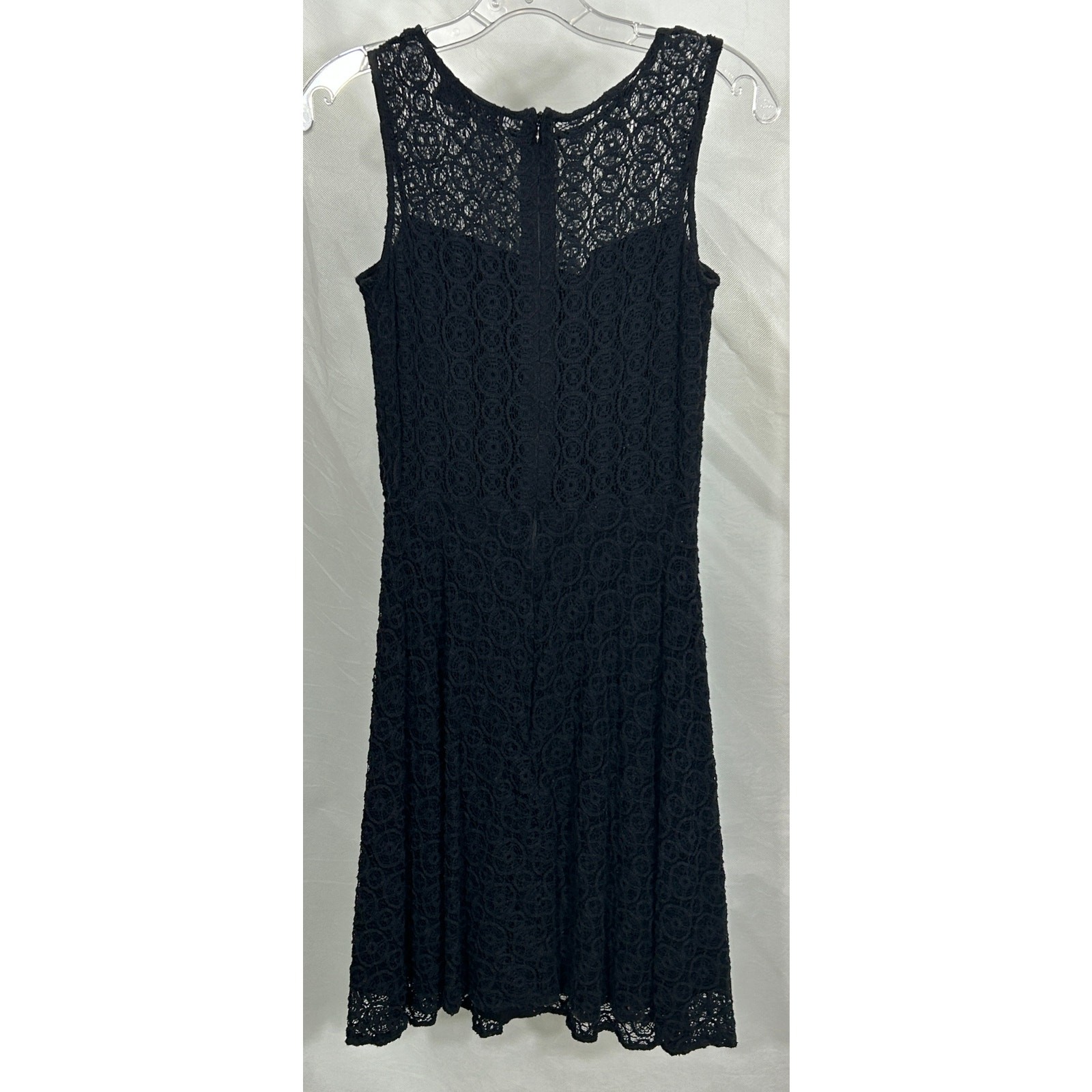 This sleeveless black lace dress by Askari (size S) features a flattering fit-and-flare silhouette with a fully lined body and semi-sheer lace detail at the upper chest and back. The intricate circular lace overlay adds texture and elegance, while the hidden back zipper ensures a sleek fit. Made in the U.S.A. from a stretch-blend fabric of 95% polyester and 5% spandex, it offers comfort and structure, making it a versatile pick for cocktail parties, weddings, or evening events. Size: Small Measurements (approximate): Pit to pit: 16" Shoulder to hem: 38" Condition: Excellent pre-owned condition with no visible flaws. *Please note, this item is pre-loved and may have minor imperfections not otherwise noted in the description.