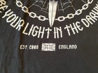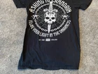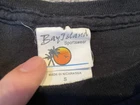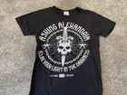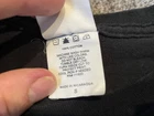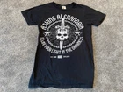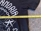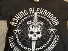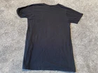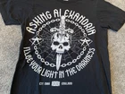 This black graphic print T-shirt is a must-have for any rock music fan. Featuring a crew neck and short sleeves, this knit shirt is made of cotton and is easy to care for with machine washing. The shirt is preshrunk and collarless, making it perfect for all seasons. The shirt is a limited edition piece from Bay Island and was manufactured in Nicaragua in the year 2000-2009. It features a classic retro look with a band logo from Asking Alexandria's 2008 tour in England. This T-shirt is perfect for any music lover who wants to show off their love for music and rock bands.