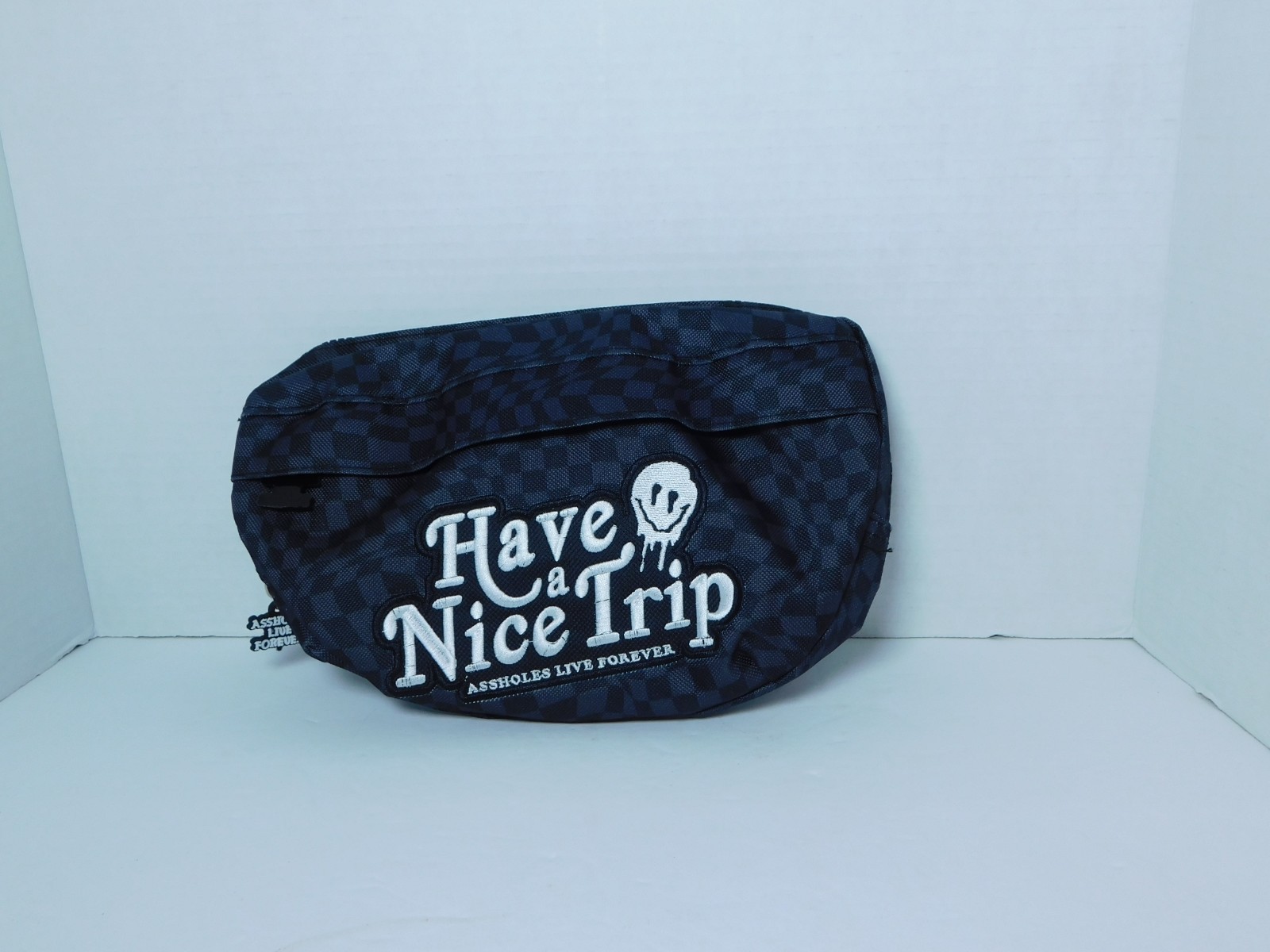 A**holes live forever fanny pack bag. Black with checkerboard and says have a nice trip on the front. Bag has two pockets on the inside and one zipper pocket on the outside. It has been removed from the packaging but never used. Please see all pics for full conition. Thank you for looking.