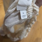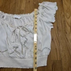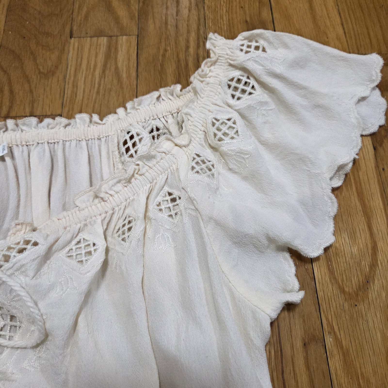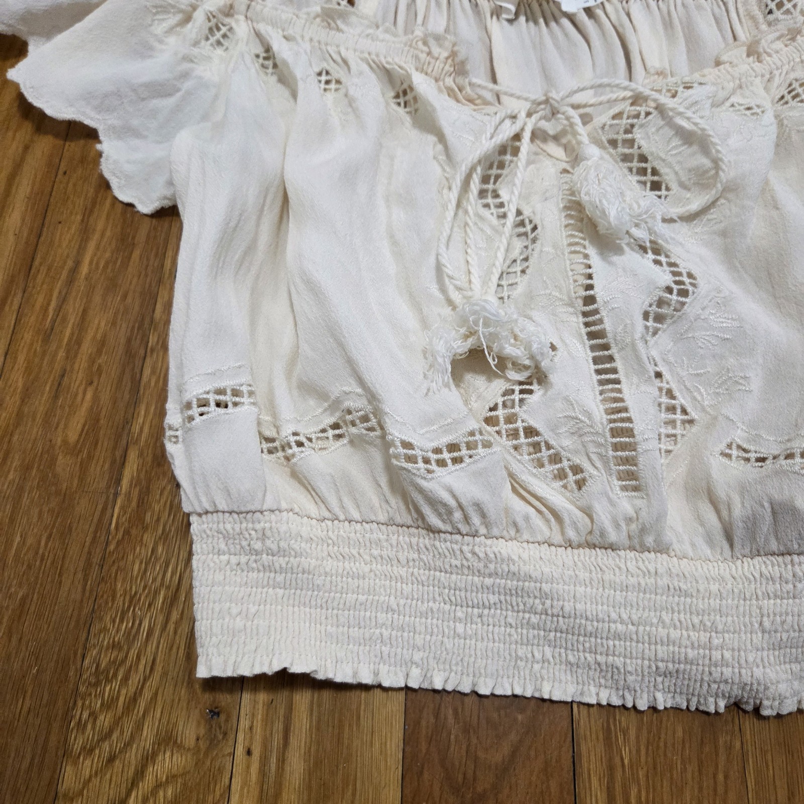 Size Small Cream Can be worn on or off shoulders Elastic waist Eyelet accent Ruffles Tassels Fairy, Peasant, boho, Bohemian, california, new york, beach, beachy, vacation, resortwear, casual, denim, short shorts, summer, spring, Miami, Cutesy, vintage like, cottage, country, Texas, cowgirl boots, dance off, sexy weekend vibes