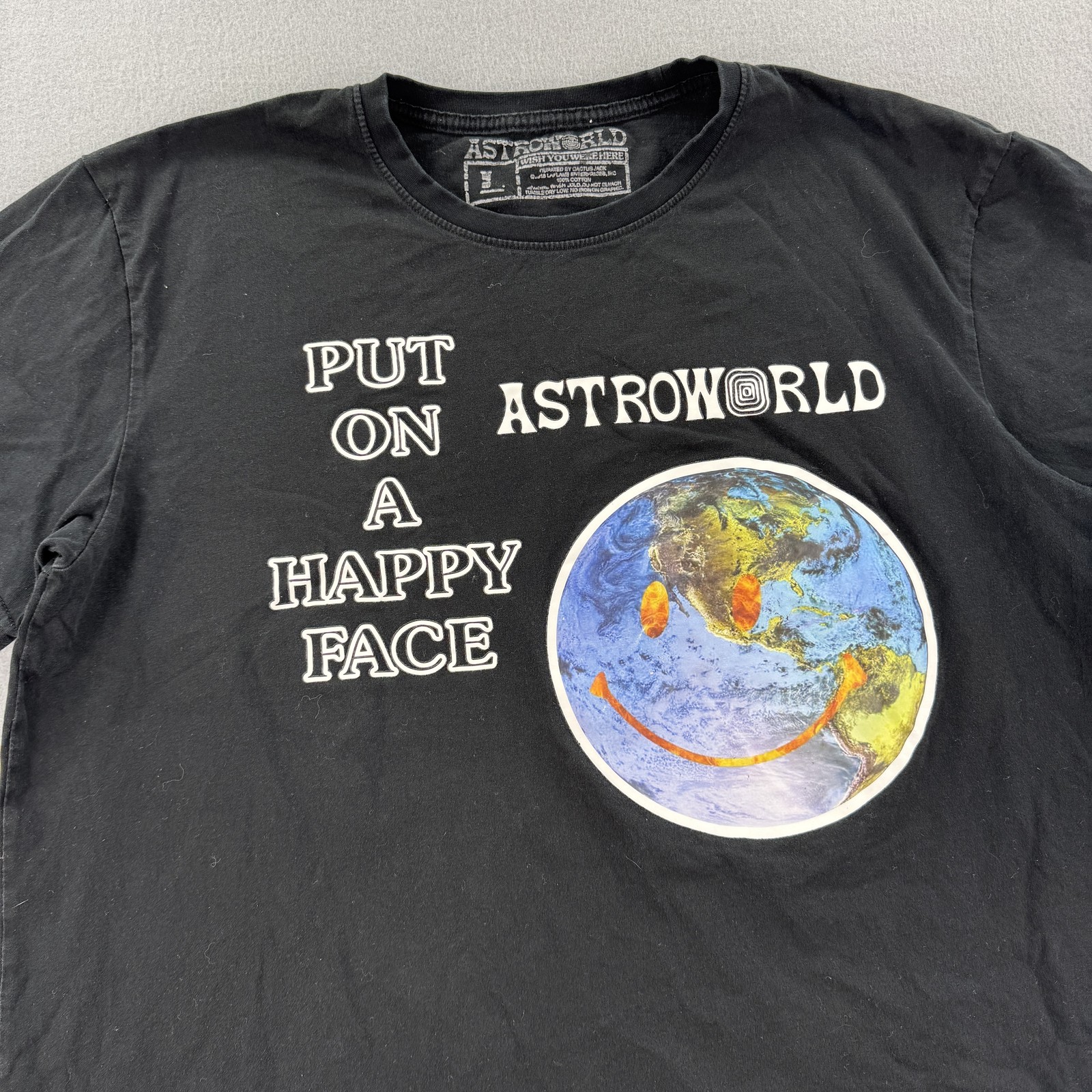 Astroworld Shirt Mens Large Black Put On A Happy Face Earth Travis Scott Down To Earth Condition: Good, light wear, minor signs of use; no major flaws noted Front features 'PUT ON A HAPPY FACE' and 'ASTROWORLD' text with a graphic of Earth showing a smiley face Back features 'DOWN TO EARTH' text with a large purple yin-yang style graphic Tag size: Large (Mens) Printed Astroworld Wish You Were Here neck tag 100% cotton Official Astroworld merch, curated by Cactus Jack Approximate measurements: 22.5" pit to pit x 28" length (see photos for measurement details) Made in Honduras Great graphic tee for fans of Travis Scott or Astroworld