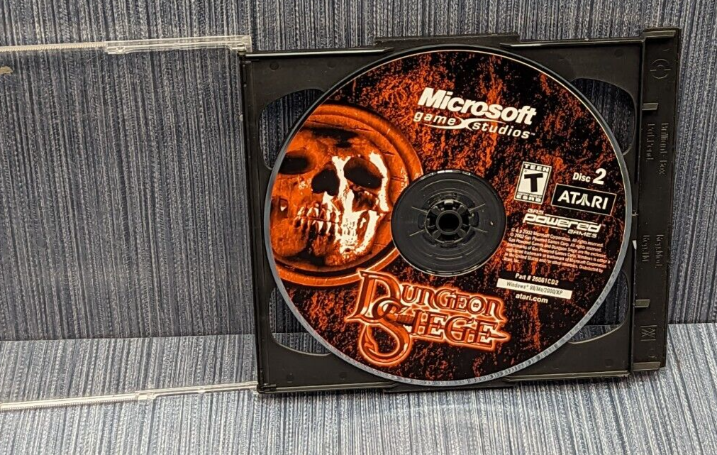 Atari / Microsoft Game Studios Dungeon Siege for PC 2004 RPG Chris Taylor UPC: 742725260610 Total Annihilation creator Chris Taylors' project entitled Dungeon Siege, an action fantasy role-playing game that combines elements of both role-playing and real-time strategy in this gigantic, continuous, fully 3D fantasy world on an adventure to discover and conquer what evil has befallen the land. Take on the evil with up to eight characters or mules to adventure with you and watching your back. Fight hordes of enemies in real-time, as you plan your next strategic move in an over-the-top battle view. Experience seamless gameplay as you journey from the highest mountain to the deepest dungeon without ever stopping to watch a loading screen.