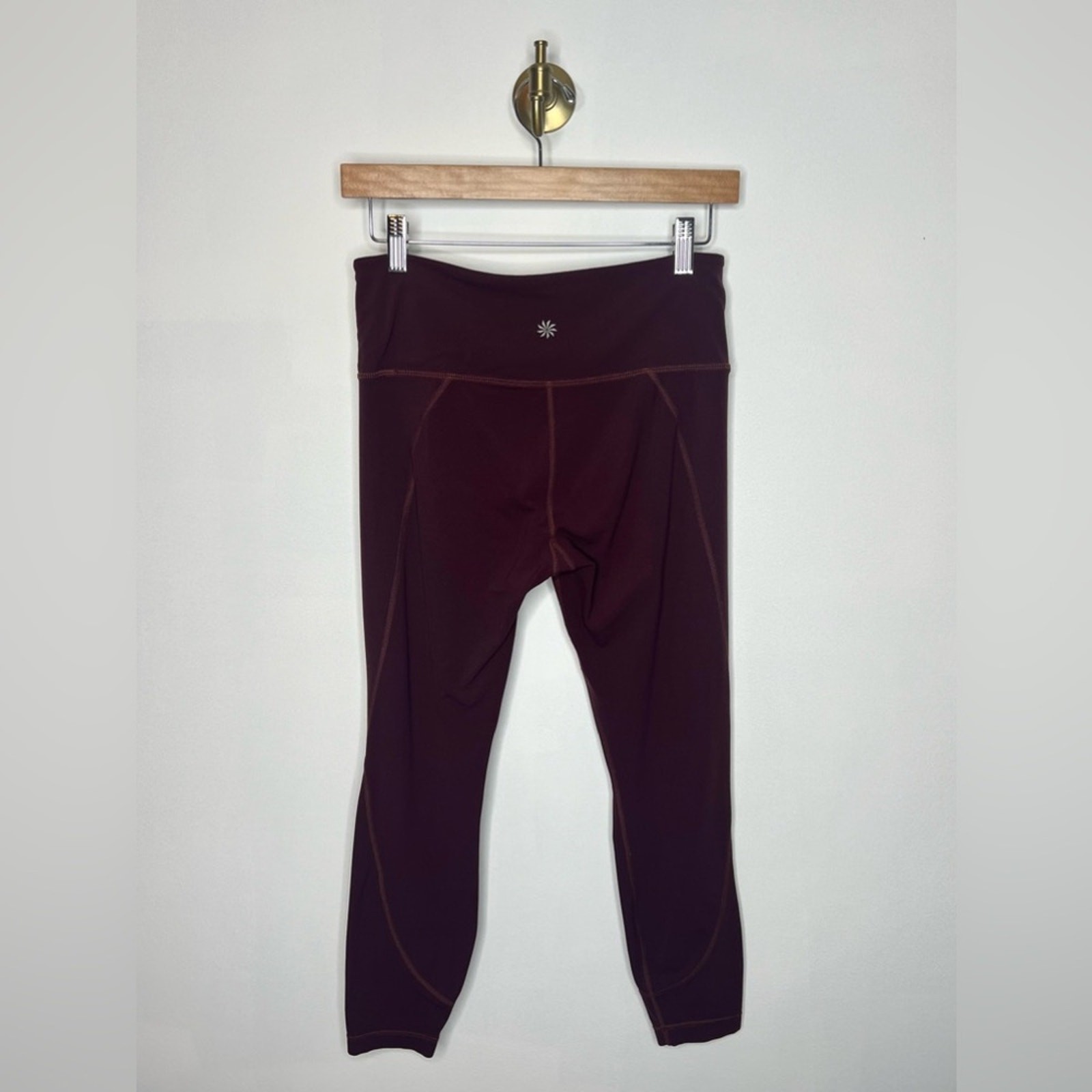 Athleta Burgundy 7/8 Legging High Rise Size- M Condition- very good preowned, minor wear/pilling 75% Nylon 25% Spandex Approx. Measurements: Waist- 27 in FR- 9.5 in Inseam- 23 in
