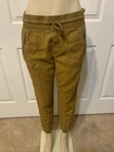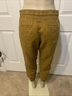 This is a pair of Athleta Cabo Linen Jogger pants in size 8, designed for casual wear. The pants come in a solid brown color and feature a drawstring closure for an adjustable waist. Made from lightweight linen fabric, they have a tapered leg style with a 27-inch inseam. The joggers are perfect for activities like walking, cycling, and hiking during the summer, fall, or spring seasons, offering comfort and style with an elastic waist and pockets for added convenience.
