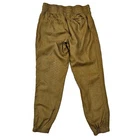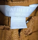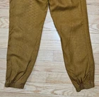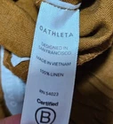Athleta Cabo Linen Jogger Pants Good pre-owned condition, no flaws 100% linen Color is toasted ocher, I would describe it between mustard yellow and brown Pull on with elastic waist and drawstring Zip pockets Marked a size 4 Approximate measurements 14.5 inches across waist when not stretched, easily stretches to 16.5 inches 10.5 inch rise 27 inch inseam
