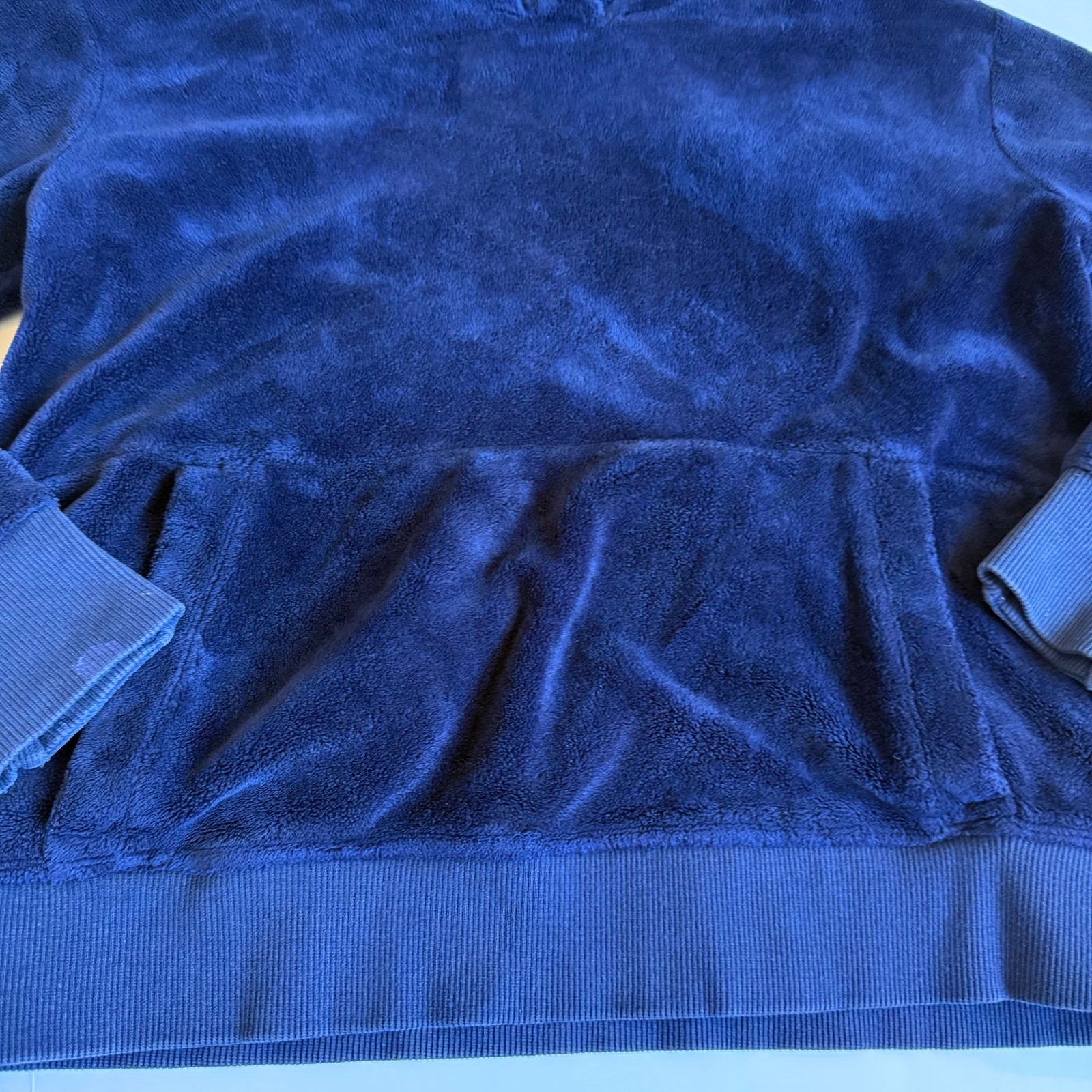 Girls size medium 8-10 Athleta Girl, Feelin Good Hoodie in Navy Blue. Super soft plush fabric. Kanga pocket. Thumb holes. Good/fair condition for paint stain on wrist. See close up photo. Otherwise great shape! So soft and comfy!! C-4577
