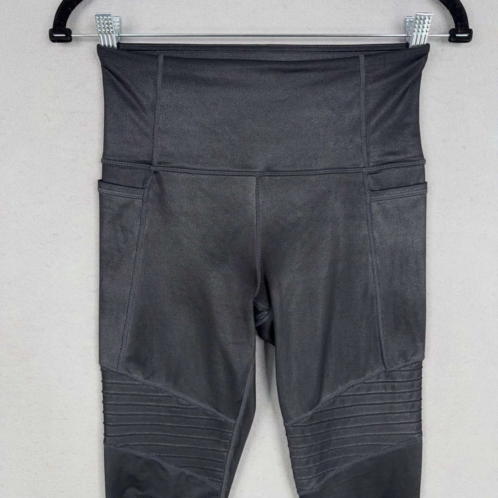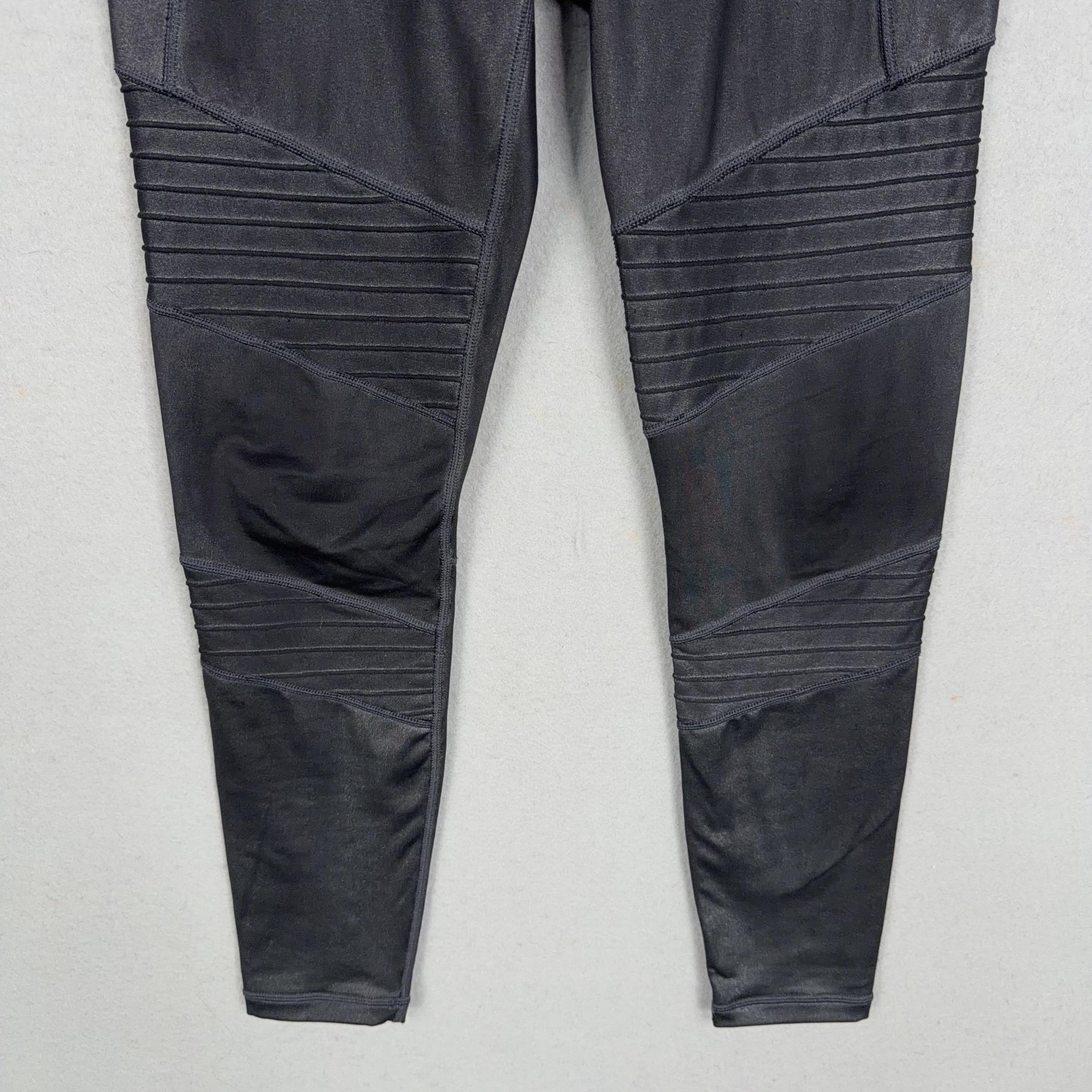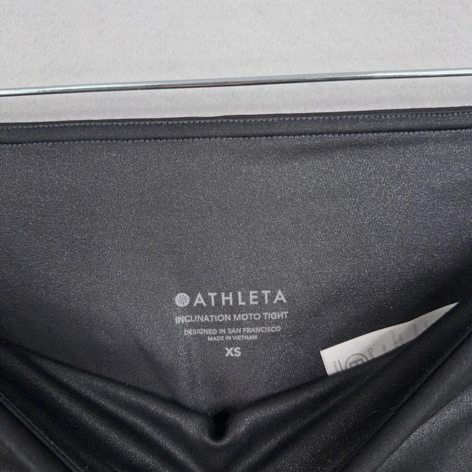 Athleta Inclination Moto Tight Leggings Womens XS Black High Rise Pockets Previously worn with light overall wear. Small faint snags on legs as shown in close-up photos. Seams, waistband, and pockets are intact and functional with no holes. Brand: Athleta Style: Inclination Moto Tight leggings with a sleek, high-rise silhouette and moto-inspired ribbed paneling. Gender: Womens Size on tag: XS Color: Black Materials: Nylon and spandex stretch performance fabric (per tag); designed in San Francisco and made in Vietnam. Details: Wide high-rise waistband, smooth fabric with subtle sheen, two side drop-in pockets, moto ribbed detailing at thighs and knees, ankle-length tight fit, small Athleta logo at back waist, Certified B Corporation branding on interior tag. Tag codes: S/S 173079 00, VJ30922, HO9, 08/19. 23347 Measurements: - Previous washings may change the sizing written on the tag. - Please refer to the photos above for all measurements. - Please compare our measurements to that of one of your favorite garments. - Please note, item measurements are approximate . All items are bagged and sealed after being photographed, then stored in a smoke free environment to ensure the item is exactly the same as
