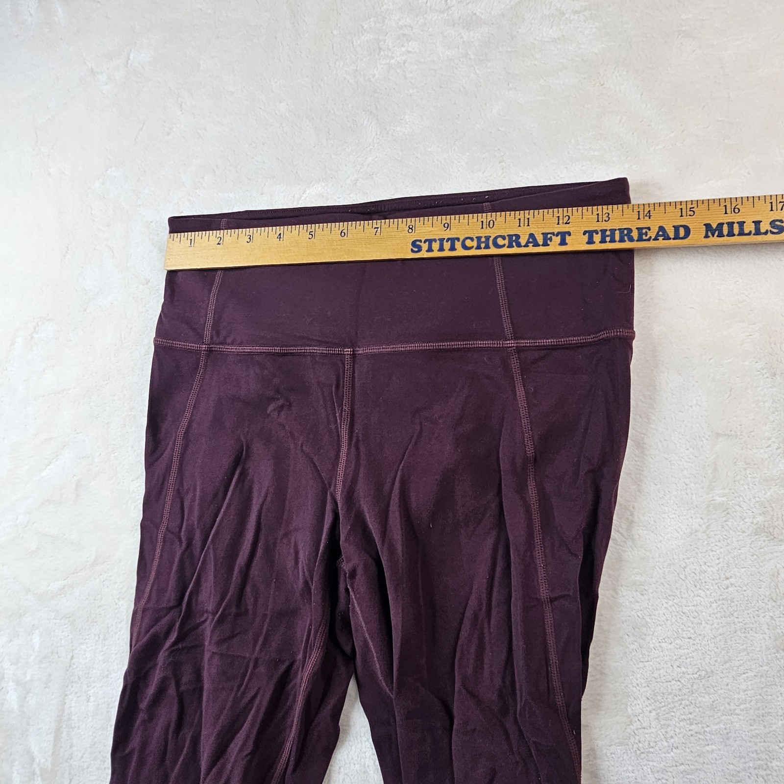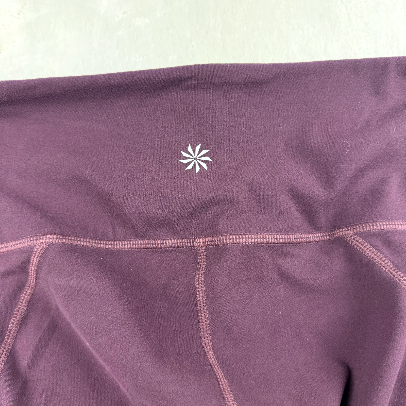 These Athleta leggings in size medium are a stylish burgundy color with a solid pattern, perfect for activewear. Made from blended fabric with a compression area on the leg, they offer a skinny leg style and ankle length. Designed for activities like gym training, yoga, and running, these leggings feature a stretchy and breathable construction for comfortable movement during workouts. The athleisure theme and athletic fit make them a versatile and functional wardrobe staple for women.