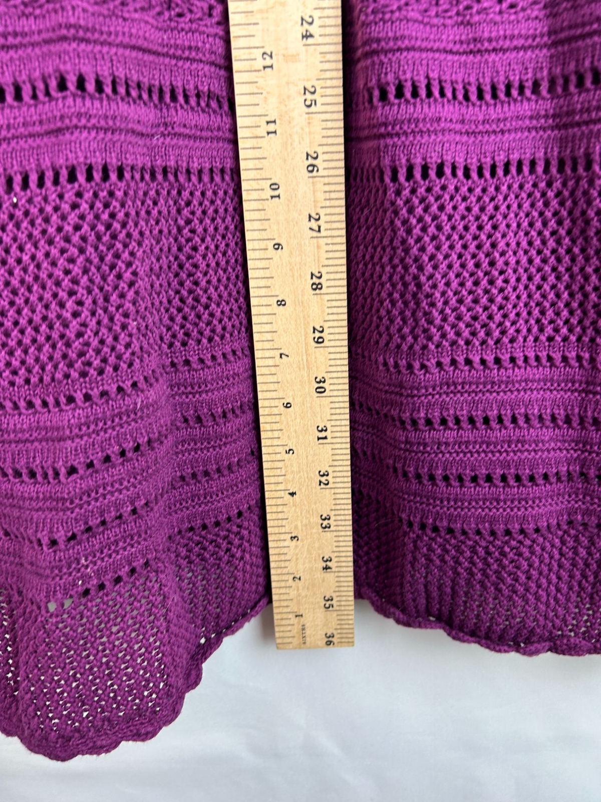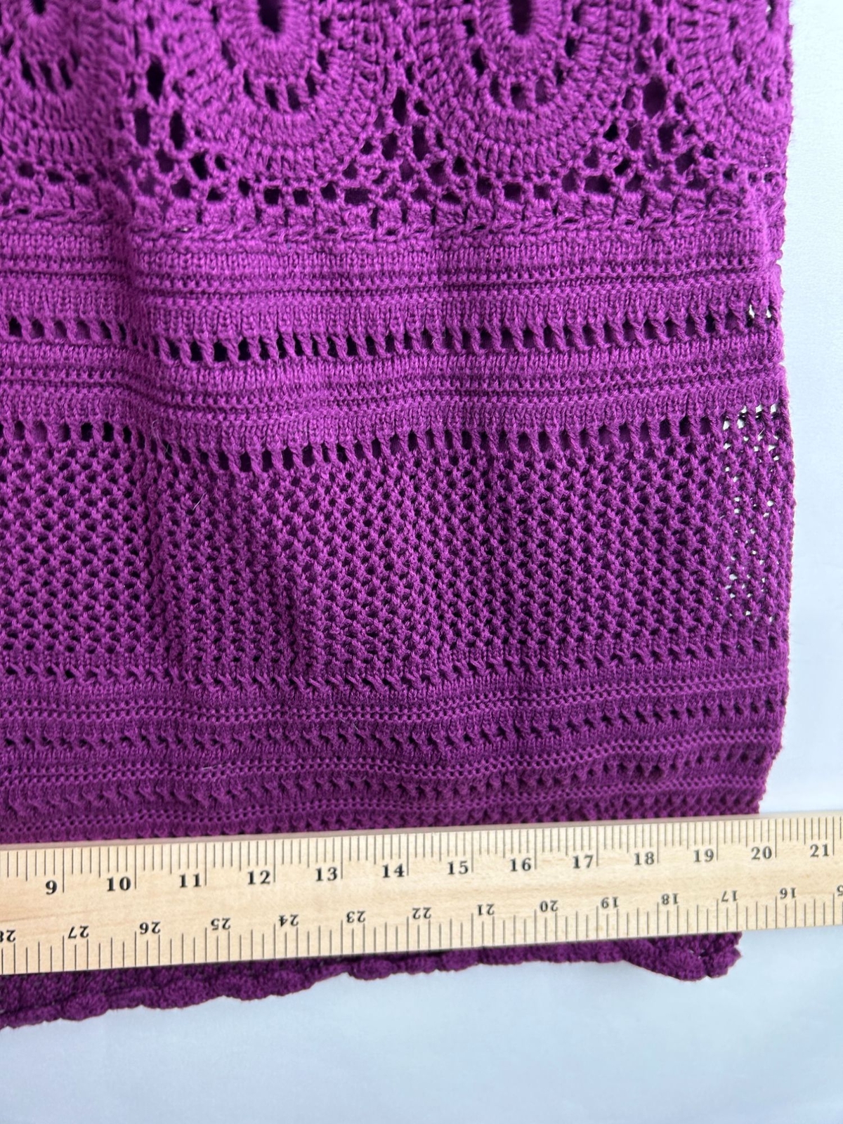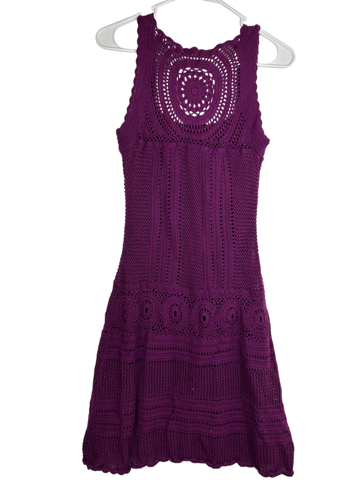 This Athleta sleeveless crochet dress, crafted from a soft cotton blend in a vibrant purple hue, offers a stylish yet comfortable fit for warm-weather outings. • Intricately designed crochet pattern • Lightweight and breathable fabric • Pullover style with no closures • Inner lining for added comfort • Measures approximately 34 inches top to bottom Top to bottom = 34 inches No notable flaws observed.
