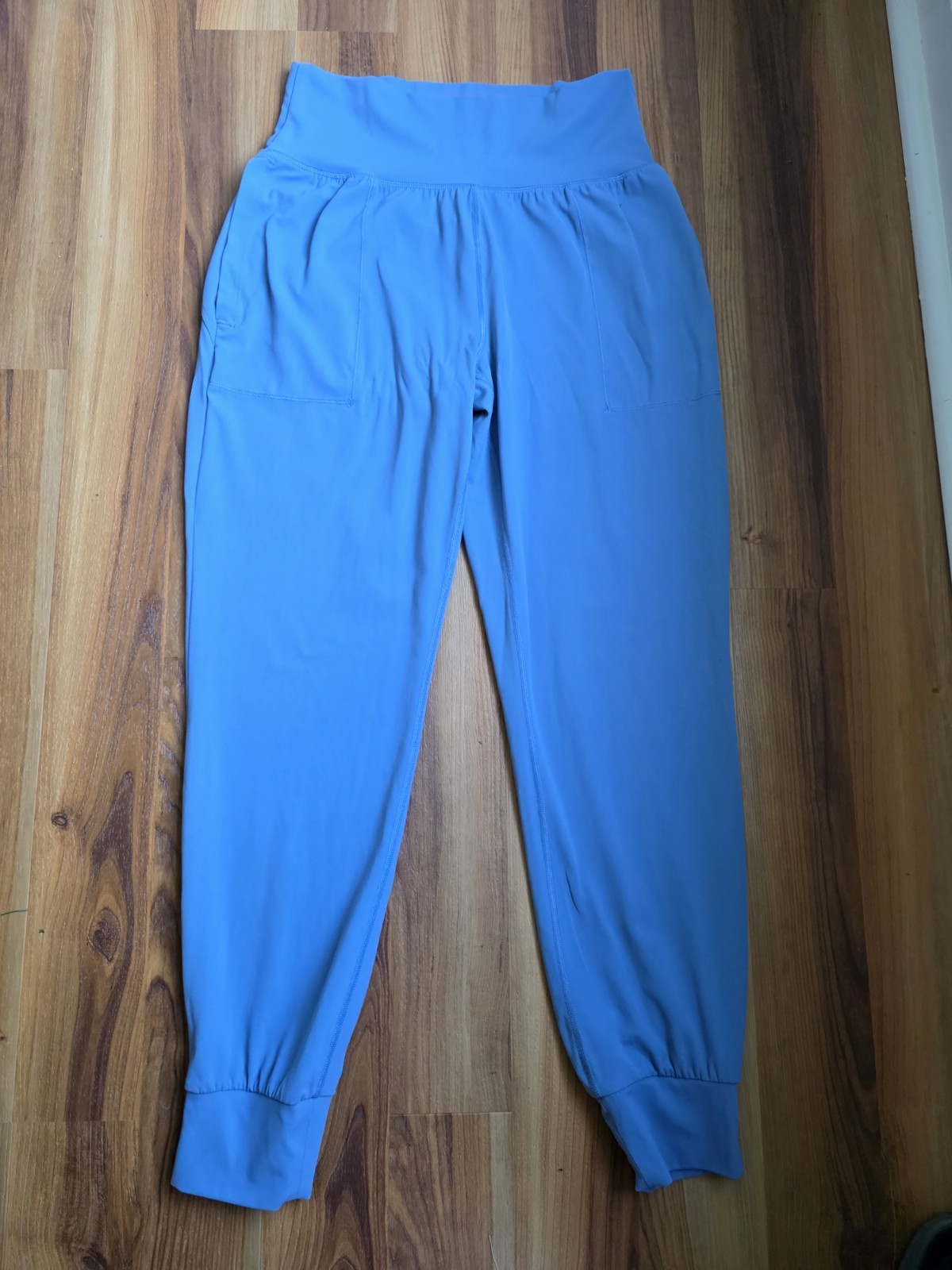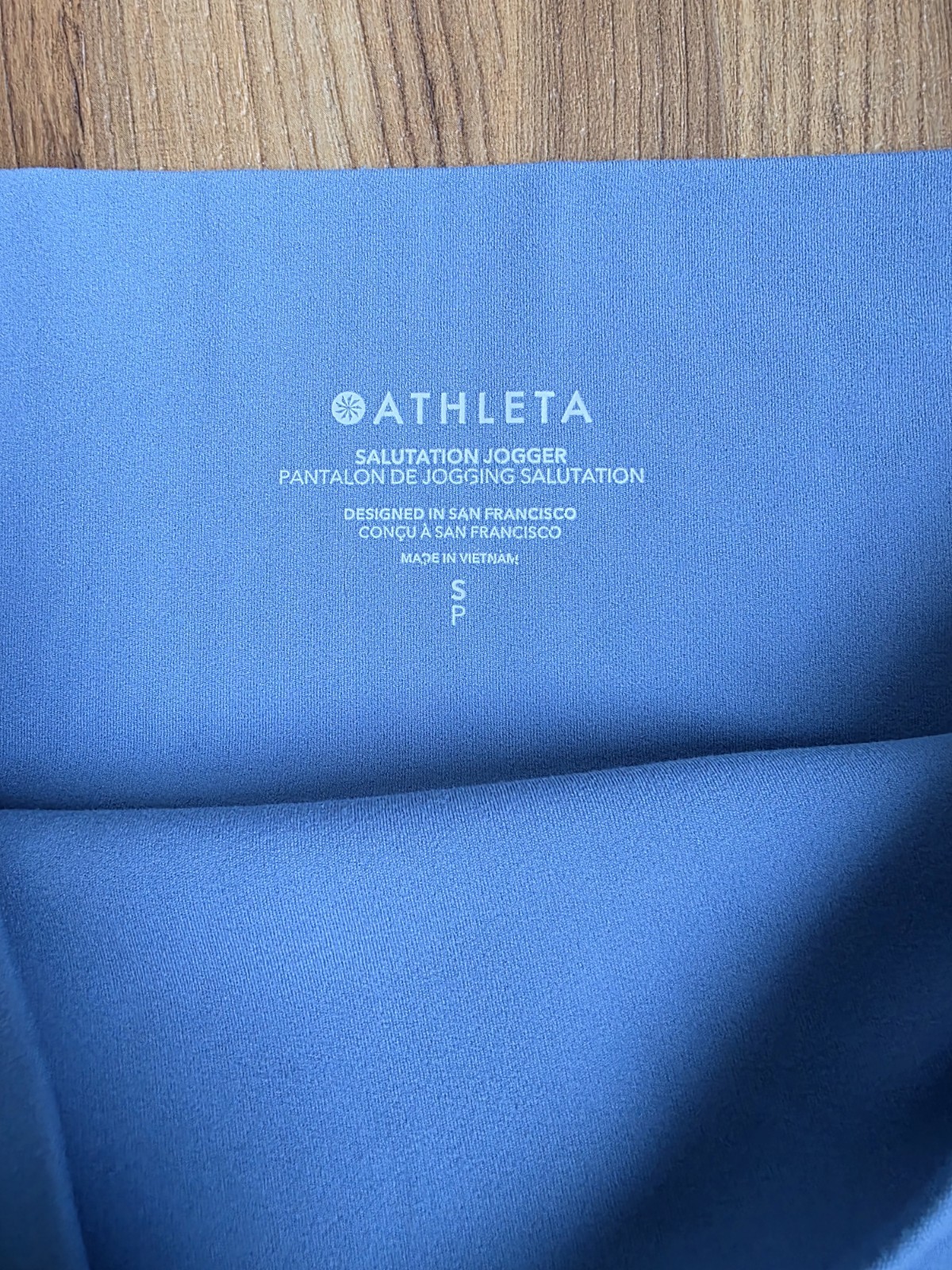The Athleta Salutation High Rise Joggers in size small are versatile leggings designed for women who value comfort and style. Made with a blend of nylon and lycra spandex, these joggers offer stretch and flexibility with a buttery soft feel for a range of activities. Has great features like pockets, a high-rise waist and curved seem in the back to flatter your form. **please note- the color of the leggings is the color from the stock photo, for some reason my camera made them look like a much bright blue instead of that muted blue. Please reach out if you have any questions or would like measurements :)