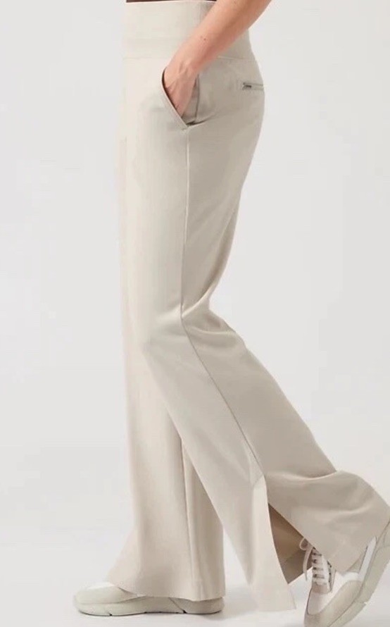 The Athleta Venice Cream Tan Flare Wide Leg Pants in size M are versatile activewear pants suitable for various occasions such as travel, yoga, casual outings, and workwear. Made from Sculptek Light fabric, these pants offer comfort, stretch, quick dry capabilities, and moisture-wicking properties. The semi-fitted design with an elastic waist and pockets, along with features like breathability and softness, makes them ideal for activities like walking, work commute, and school. In a solid beige color, these Athleta pants are a stylish and practical choice for active women looking for both style and functionality in their wardrobe.