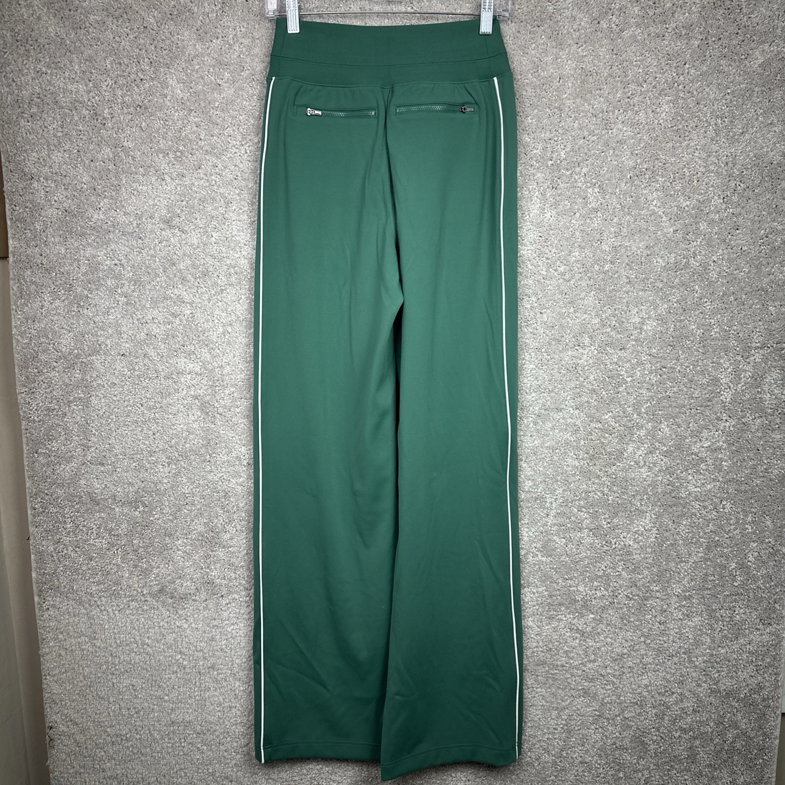 The Athleta Venice High Rise Track Stripe Wide Leg Green Pant in size XS Tall is a versatile and stylish piece perfect for travel, activewear, or casual occasions. Made from a blend of nylon and spandex, these pants offer comfort, stretch, and moisture-wicking properties. The green striped design adds a touch of athleisure style to the semi-fitted wide-leg silhouette, making them a practical and fashionable option for any season. With features such as UV protection, quick dry technology, and pockets, these pants are both practical and chic, representing the quality and performance that Athleta is known for.