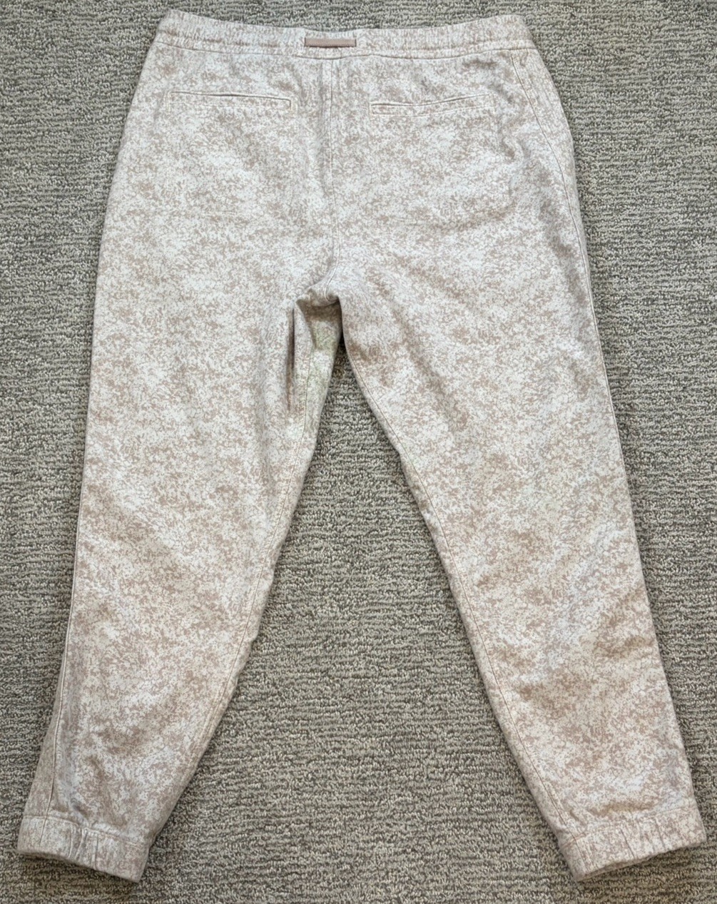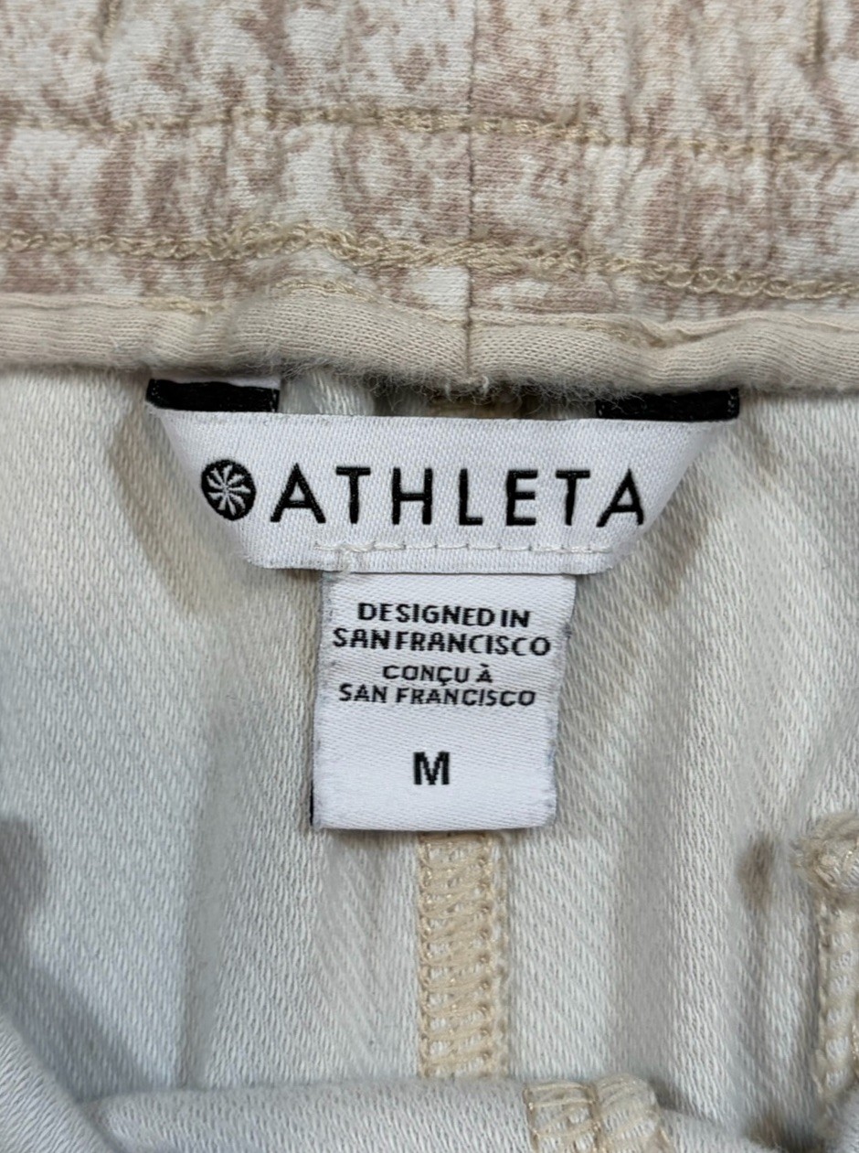 Stain shown in picture*** These Athleta Venice Joggers are perfect for women looking for comfortable and stylish athletic wear. The all-over print design adds a fun and trendy touch to the beige pants, while the pull-on closure and tapered leg style offer a secure fit for various activities. Made of a blended fabric of nylon and spandex, the joggers are machine washable and feature compression areas at the waist for added support. With features like zip pockets, moisture-wicking, and breathable fabric, these joggers are ideal for walking and other active pursuits year-round.