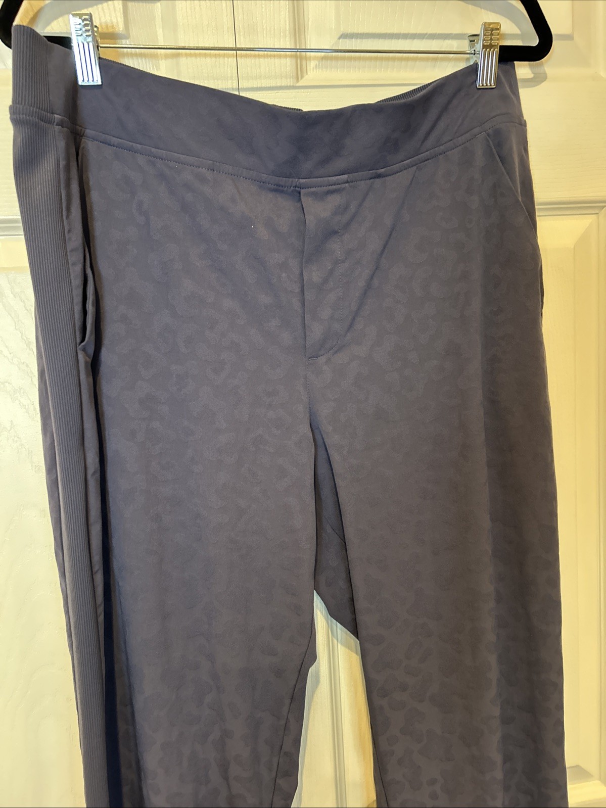 Athleta Brooklyn Textured Ankle Pants women's size 16T in charcoal grey with a subtle leopard print. These stylish and comfortable pants feature a flattering elastic waistband with a ribbed texture on the sides, a zip fly with button closure, and two back welt pockets. The ankle-length cut with side slits offers a modern silhouette, making them perfect for everyday wear, travel, or a casual office setting. Measurements: • Waist: 36 in • Inseam: 30 in Department: Women Style: Ankle Type: Pants Performance/Activity: Yoga, Gym & Training Product Line: Athleta Trekkie Leg Style: Tapered Theme: Athleisure Features: Pockets, Elastic Waist, Textured, Slit, Stretch Occasion: Activewear, Casual Material: 100% Polyester, Spandex Closure: Pull On Fabric Type: Blended Fabric Keywords: Athleta pants, leopard print pants, textured trousers, women's activewear, comfortable pants, casual pants, travel pants, office attire, ankle length, athletic pants, stretch pants, plus size pants, modern fit