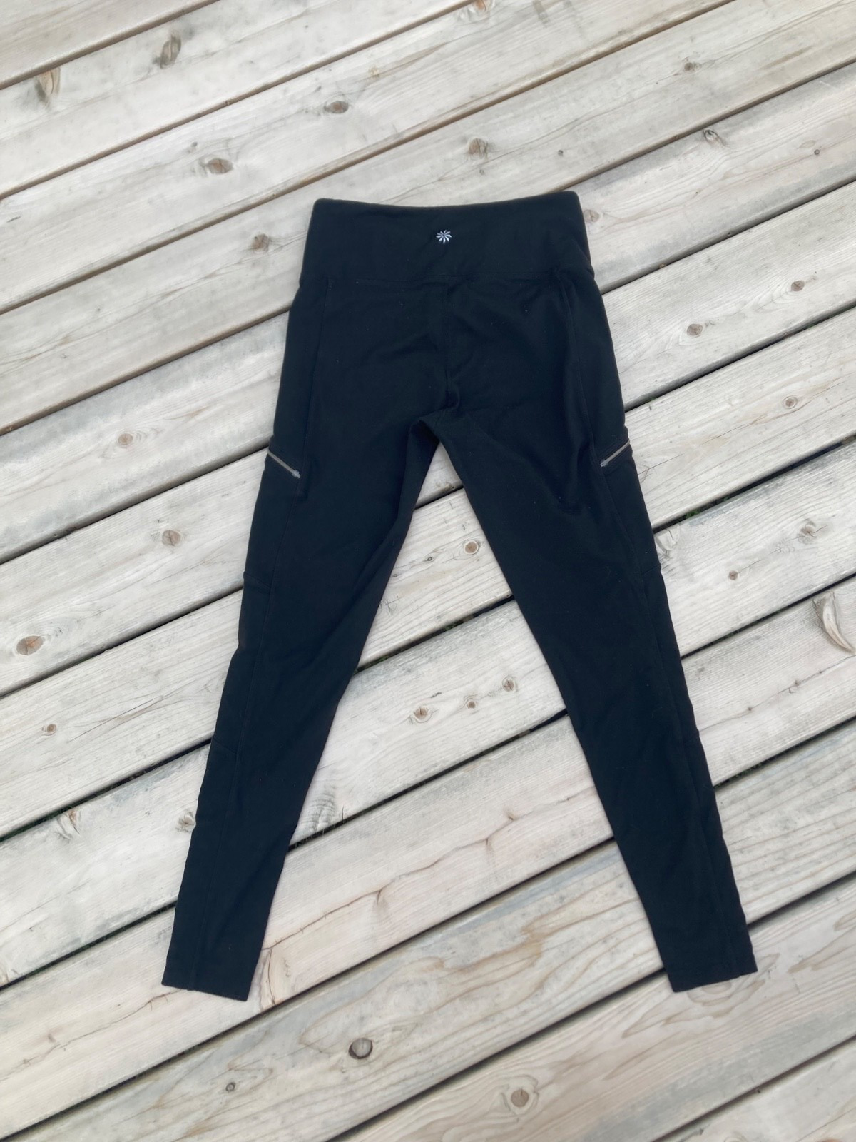 The Athleta leggings in black with zippered pockets, size M, are designed for women who prioritize both style and performance in their activewear. These ankle-length leggings feature a compression area specifically targeted at the legs, offering support during activities like gym training, cycling, yoga, and running. The classic black color and sleek design make these leggings versatile for various occasions, while the Athleta brand ensures high quality and comfort. Perfect for women looking for leggings that combine fashion and functionality in their workout wardrobe. No flaws or noticeable piling, freshly washed.