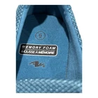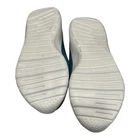 Brand: Athletic Works Style: Womens slip-on athletic sneakers with low-profile mesh uppers and cushioned white soles. Color: Solid teal blue uppers with matching trim and white midsoles and outsoles. Size: Womens US 6 as marked on the insole and retail hangtag. Upper material: Breathable mesh textile with synthetic overlays at the toe and heel. Outsole material: Lightweight cushioned rubber/foam outsole with flex grooves for traction. Details: Easy slip-on design with stretch side openings, padded collars, heel pull tabs, memory foam insoles, and standard width fit. Model/Label: Athletic Works Memory Foam line; style code 26VERITYW19 printed on hangtag; UPC: 628920935075. Type: Comfortable lightweight walking and casual athletic shoes suitable for everyday wear, errands, or travel.