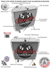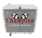 Champion Cooling radiators are tig welded with aircraft grade aluminum. Every radiator comes with a limited lifetime warranty so you can buy with confidence! Product Specifications: Core (H x W): 20" x 23" - Overall (H x W): 26.25" x 26.75" - Hose Locations (In x Out): Center x Driver - Hose Fittings (In x Out): 1.5" x 1.75" - TOC: 1/8-27NPTPlease click on the "Read more" link below to view a complete item description with product videos and additional items to upgrade your cooling system. PART INFORMATION Shipping Payment Policies Contact Us Part Information Related Items Genuine Champion Cooling Systems Part #MC5356 This radiator is designed for either a V6 or a V8 engine but does NOT work on a flathead engine. (Please Verify Your Radiator Core size Before You Buy) Features Higher density core: cooling rows are spaced 3/8" apart: giving you 25% more rows within the core than other aluminum radiators sold on eBay and 35% more rows than OEM copper. Aluminum dissipates heat more efficiently than copper or brass. 14-16 cooling fins per inch (42 per square inch) giving you approximately 1500 more cooling fins than other aluminum radiators and approximately 3000 more than OEM copper radiators. Lighter weight. Outperforms other 2, 3 and 4 row copper radiators. High performance appearance. You get "BIG BLOCK COOLING" and "PEACE OF MIND" when you drive your car with a Champion Cooling Systems radiator. You could easily spend $400 - $1,000 more for a radiator of similar quality. Specifications Down Flow Or Cross Flow Type: Down Flow Mounting Type: Bracket Tank Material: Aluminum Core Material: Aluminum Overall Height: 26 1/4 Overall Width: 26 3/4 Core Height: 20 Core Width: 23 Inlet Location: Center Inlet Diameter: 1 1/2 Outlet Location: Driver Outlet Diameter: 1 3/4 Core Row Quantity: 4 Row Transmission Oil Cooler Fitting Type: 1/8-27NPT Internal Transmission Oil Cooler: Yes Filler Neck Attached: Yes Core Thickness: 2 3/4 Core Tube Width: 0.56 This package includes a 4 Row All Aluminum Radiator and a 16" electric fan. Champion Cooling Systems radiators are manufactured at their ISO certified facility. They are made to high standards of quality and workmanship using the Highest Grades of aluminum available and are constructed with 100% welded seams, brazed core technology and no epoxy. They come with a Lifetime Limited Warranty and are made to install with little or no modifications using your Original Mounts giving you the confidence you desire. Shipping Shipping Shipping Policy FedEx Ground Service to the Lower (48) States: FREE SHIPPING. (Hawaii and Alaska $95.00 Additional Shipping Charge). International Shipments are via FedEx International (See Shipping Drop Box For Prices). Payment Guarantee Policies Contact Us Thank You!