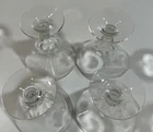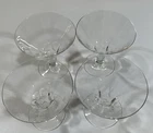 DELICATE AND GORGEOUS!! Vintage ATOMIC AGE (1950 -1960's) Clear Glass Coupes. MARTINI GLASSES. SET of 4. Champagne /Tall Sherbet Glasses. SPUTNIK COCKTAIL GLASSES!! VERY ART DECO! Crystal, a lovely sound when pinged! Description: Clear Glass Coupes - Convex shape. Etched w Vertical lines-Moonbeams, Coins Design on Base of Glass. Crystal Ball Stem, 4 5/8" Tall x 4.5" in Diameter. No makers mark. Holds 5 Ounces. VGC Please see the attached pictures and item specifications. No chips,cracks or scratches. No discoloration. A definite talking point when used! THE AGE OF AQUARIUS!