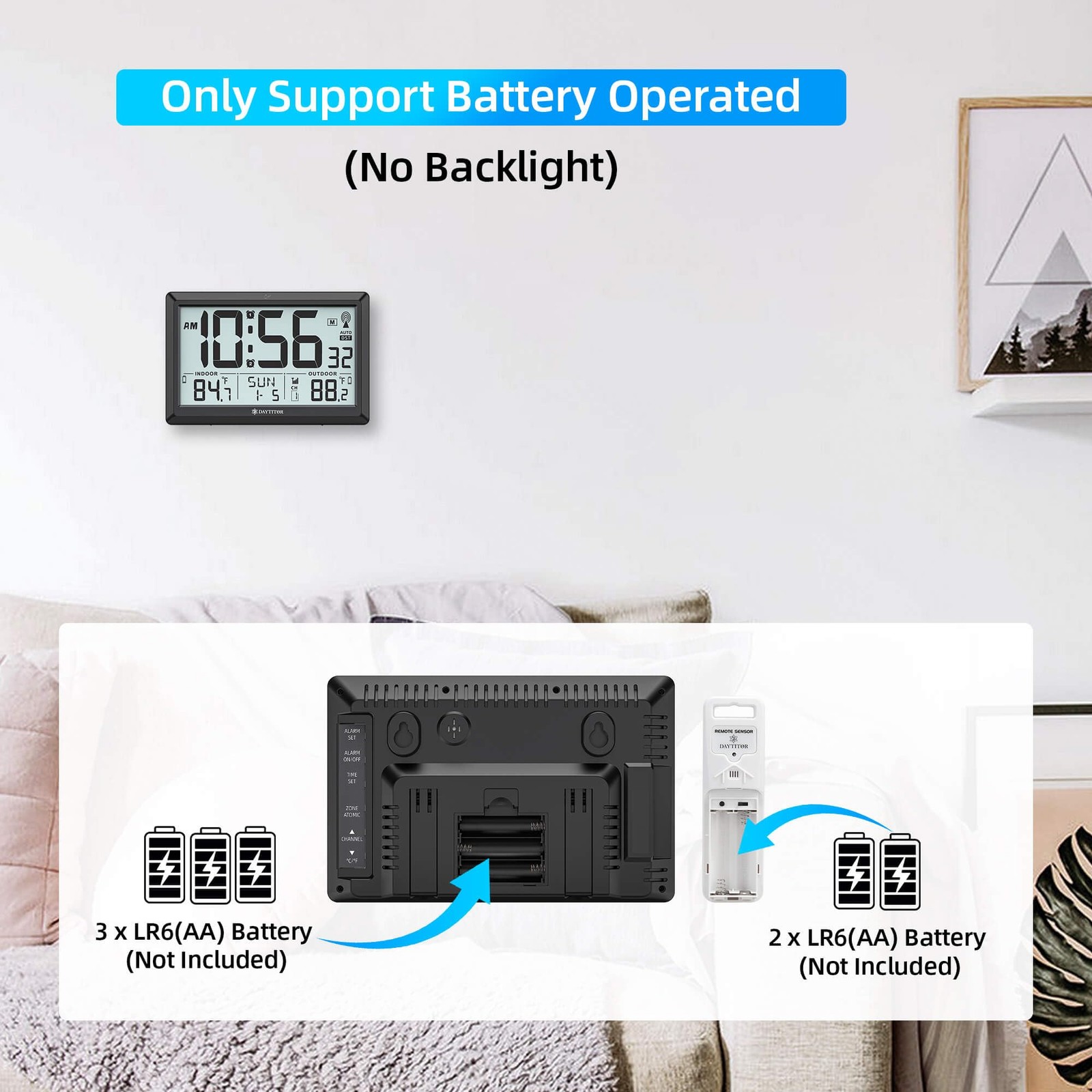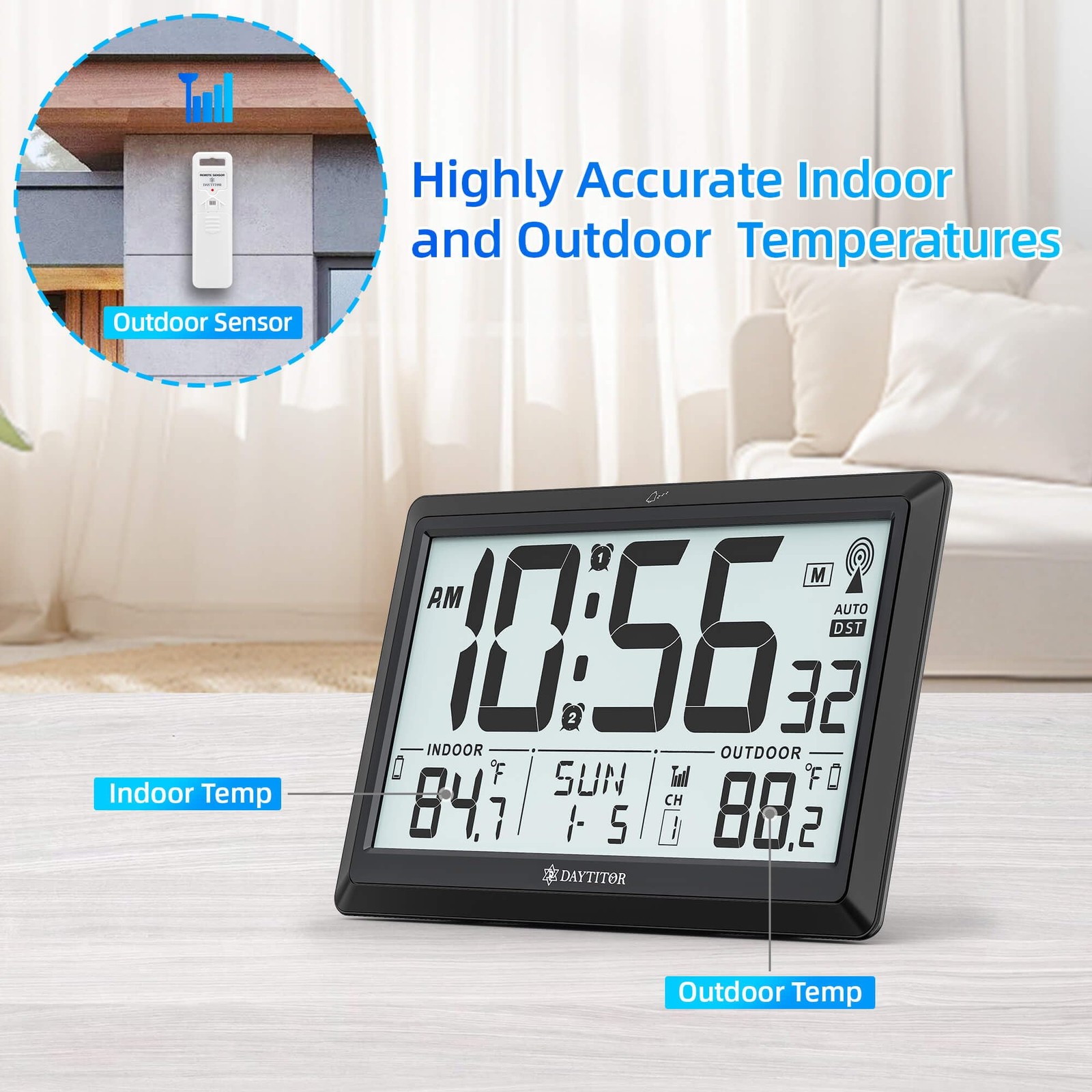 Accurate atomic clock-no need to set.The atomic clock has a built-in receiver that can automatically synchronize with WWVB radio broadcasts.Wireless outdoor temperature sensor-The wireless outdoor sensor transmits the outdoor temperature to the atomic clock.The sensor should be placed within 100 feet of the clock.In addition,the clock is equipped with a high-quality indoor temperature sensor,so you can read the temperature inside and outside the room Accurate Atomic Clock: No setting required. The digital atomic clocks has a built-in receiver that automatically synchronizes with the WWVB radio broadcasts from NIST of the U.S. Government in Fort Collins, Colorado,which will automatically update time at 1,2,3,4 and 5 AM, to ensure the time is accurate. Atomic Clock with Indoor/Outdoor Temperatures: To help you better manage your daily life, the atomic clock displays both indoor and outdoor temperatures.The indoor temperature display relies on the built-in high precision indoor temperature sensor. The outdoor temperature gets outdoor temperature information from the wireless outdoor sensor,the sensor should be placed within 330 feet of the clock. Easily Read with Large Display Digital Clock: The display of atomic clock digital can show many information,including 12/24 hour time format, with accurate and clear display of seconds, minutes and hours,4 time zones to choose from (PST, MST, CST, EST),alarm aclock, automatic daylight saving time,temperature display in degrees Celsius (°C) or degrees Fahrenheit (°F). Battery Operated Digital Wall Clock: The battery powered alarm clock and wireless outdoor sensors are only supported by AA batteries(3 x AA batteries for atomic digital clock and 2 x AA batteries for outdoor sensor, not included). When the batteries are about to run out, a low battery indicator will appear on the screen to facilitate timely replacement of the battery. Widely Used And Satisfactory Service: Use the digital atomic clocks as a wall clock or desk clock, it is suitable for bedroom, living room, office, kitchen, garage, RV, etc. If you encounter any problems in table clocks use process, please let us know at any time, and we will provide satisfactory after-sales service within 24 hours!