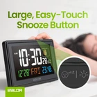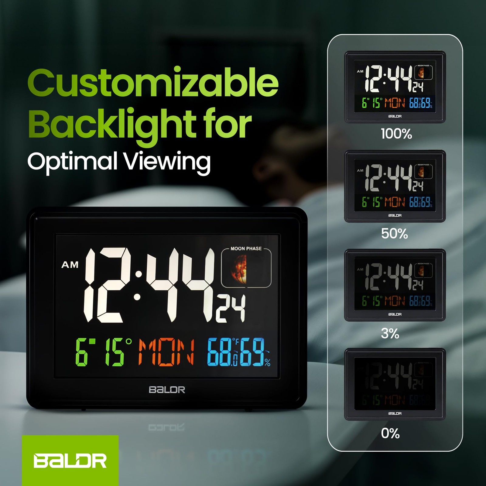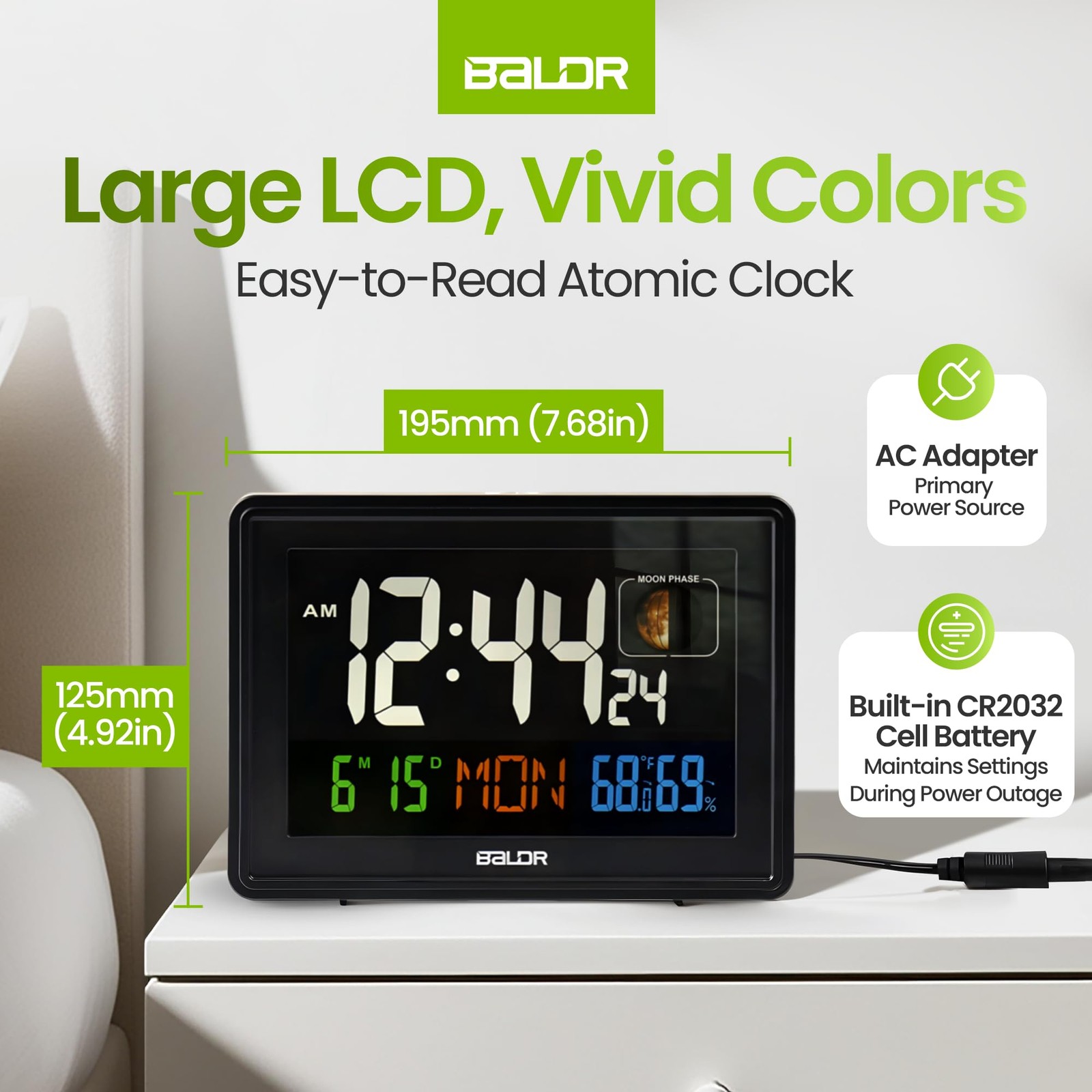 Our atomic clock automatically adjusts the time and calendar date with the WWVB radio broadcast by the NIST in Fort Collins, Colorado. The clock also self-updates for daylight saving time (DST). Please note that the atomic feature only functions in North America and works typically at midnight or in the very early hours of the morning. The clock features a white backlight with adjustable screen brightness, making it easy to read the time, date, weekday, indoor temperature, humidity, and real-time moon phases, day or night. It also comes with a snooze button on top to allow you to catch a little extra shuteye before alerting you again, and a sound that turns off but automatically comes on again after five minutes. The clock is powered by the supplied AC adapter and includes a built-in CR2032 cell battery to store the time and alarm settings if the power is interrupted. A low battery sign will appear on the clock when it is time to replace the cell battery. You can activate the dimmer feature by pressing the "Snooze/Light" button on top of the clock. ACCURATE TIMEKEEPING WITH ATOMIC CLOCK TECHNOLOGY – The atomic alarm clock automatically syncs with WWVB radio signals, ensuring precise time updates automatically (works only in North America, updating at midnight or early morning). Ideal for bedrooms, living rooms, and classrooms, it ensures you stay on time. Whether used as a desk or wall-mounted clock, the backup battery keeps your settings safe during power outages, for reliable performance in any situation. MULTIFUNCTIONAL DISPLAY FOR COMPLETE INFORMATION – Our atomic clock digital’s large color display shows the time, date, day, indoor temperature, humidity, and moon phases, making it a versatile addition to any room. Whether you need an atomic clock with indoor/outdoor temp for weather monitoring or a clear clock with date and time for the elderly, our small atomic desk clock or digital clock for living rooms keeps essential information easily accessible. EASY SETUP AND MAINTENANCE WITH AUTO-ADJUSTMENT – Our atomic digital clock offers a hassle-free setup with automatic time adjustments and daylight saving updates, making it a reliable auto-set alarm clock. The backup battery ensures all settings are retained during power outages. Designed for convenience, it suits busy families, seniors, and teachers who need a straightforward classroom digital clock with minimal manual effort. VERSATILE PLACEMENT FOR ANY SPACE – Whether you need a plug in digital clock for your desk, wall, or nightstand, our atomic wall clock offers flexibility with both tabletop and wall-mount options. Suitable for use as a modern digital clock in living rooms or as a small digital clock in classrooms, it features adjustable brightness for comfortable viewing at any time of day or night. It also works well as a compact, easy-to-carry digital alarm clock. ENHANCED COMFORT WITH QUIET AND ADJUSTABLE FEATURES – Enjoy a peaceful environment with our silent atomic clock, ideal for light sleepers and kids’ bedrooms. The adjustable brightness ensures a gentle nightlight, making it useful as a nightstand clock or a kids’ digital wall clock. Also functional as an alarm clock with moon phase tracking, it supports a comfortable atmosphere in any room, from bedrooms to offices.