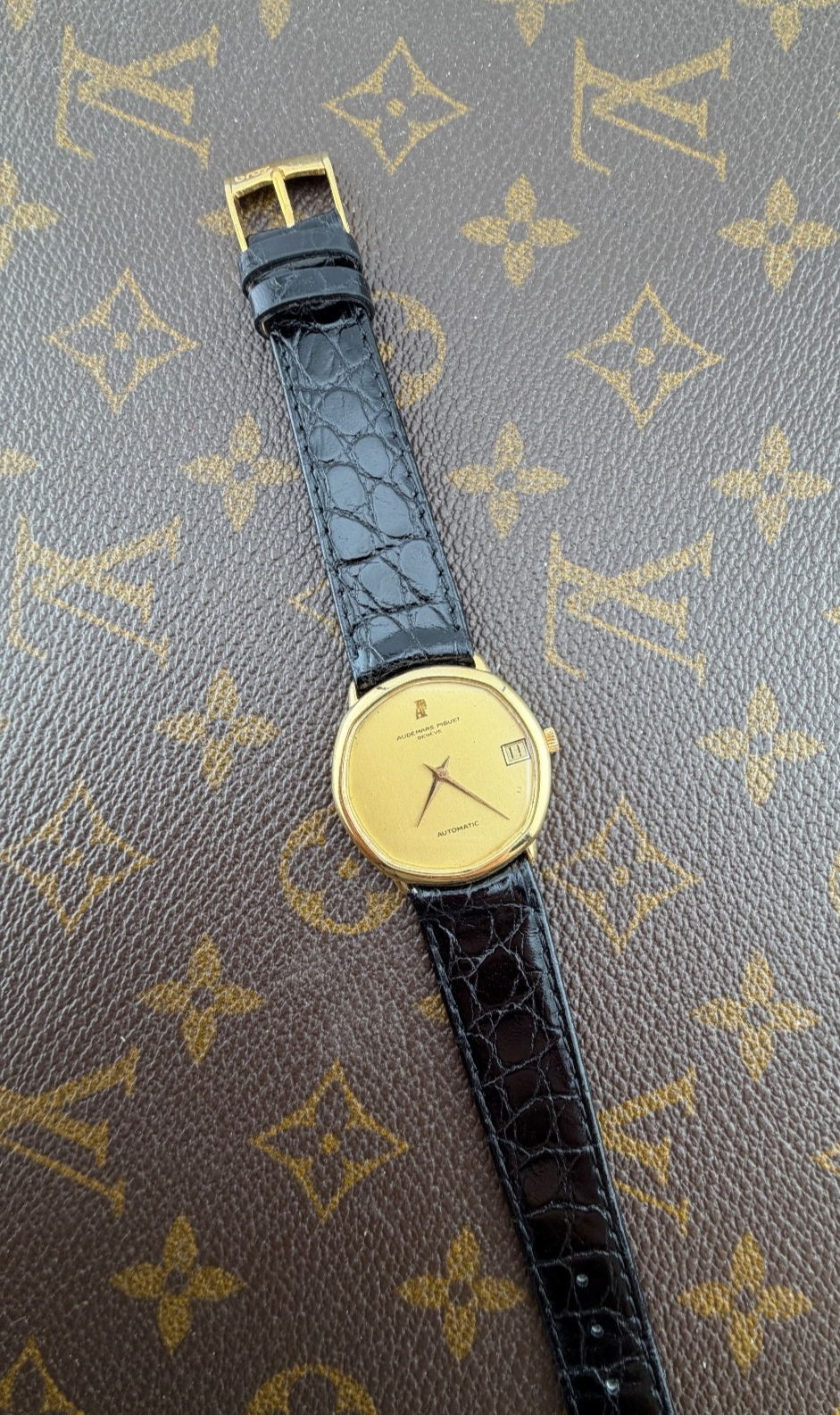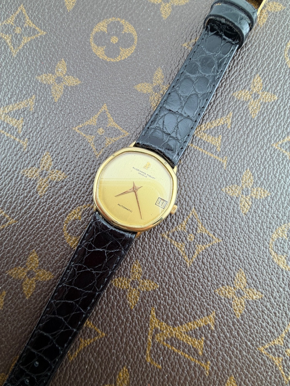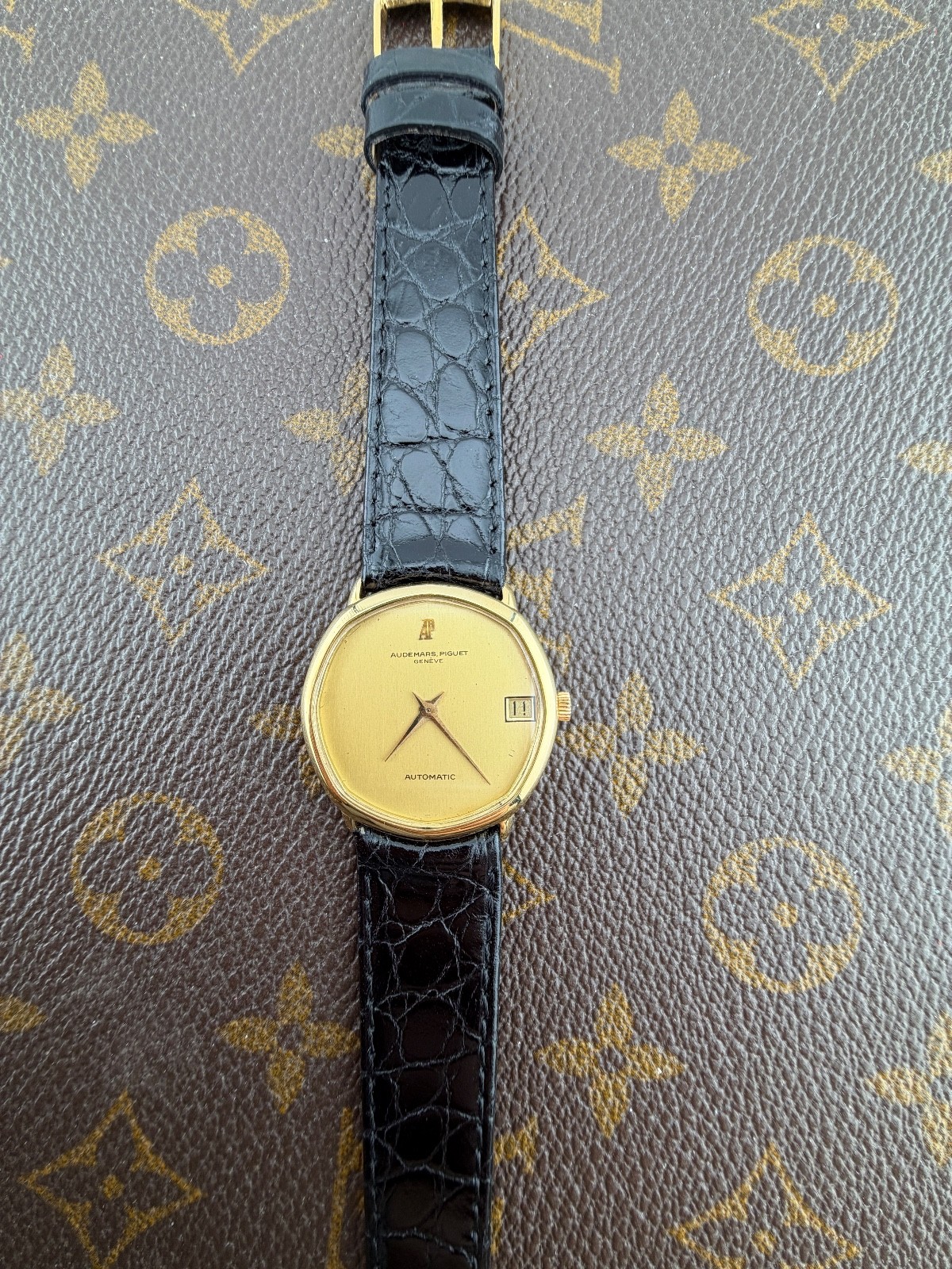 PROPONIAMO; -Marca: AUDEMARS PIGUET -Cassa: ORO GIALLO DA 32,5MM , FONDELLO A SCATTO LOGATA -Movimento :ORIGINALE CALIBRO 2121 AUTOMATICO COEVO -Vetro:ZAFFIRO -Corona:ORIGINALE IN ORO -Ghiera:NO -Tasti: NO -Quadrante: CHAMPAGNE ORIGINALE -Lancette: ORIGINALI ORO GIALLO -Cinturino/Bracciale: PELLE LUCERTOLA DA 18MM GENERICO NUOVO -Scatola e documenti: NOSTRA POCHETTE IN VELLUTO COMPRESA -Condizioni : BUONE , ALCUNI SEGNETTI DEL TEMPO MA IN BUONE CONDIZIONI -Revisionato: SI ANNO 2025 -Uomo/donna/unisex: UOMO/UNISEX PER QUALSIASI DUBBIO CONTATTATEMI ,RISPONDEREMO IL PRIMA POSSIBILE !
