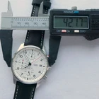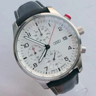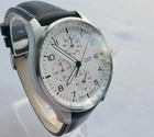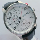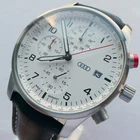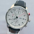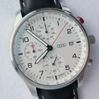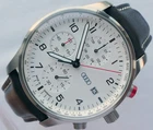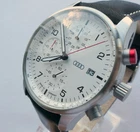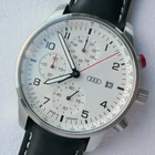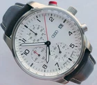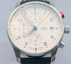 Genuine Audi Sport Chronograph !!! Made in Germany. Rare model, yet along in this condition: brand new, unworn/unused condition, complete with the original box and papers, still has the plastic foil on the back, NEW, NEW, NEW has the original hand made in Germany leather band. Japan movement inside with 4 beats center chrono second hand, moving smoothly, almost like a mechanical chronograph. Hand made in Germany genuine leather band, premium quality. RARE MODEL !!! A brushed stainless steel case and a slightly convex K1 Safety mineral crystal glass, will safeguard your timepiece for many years to come. The white dial with a raised inner ring that has a black printed Tahcymeter scale on it, black printed markers for the minutes, black printed Arabic numerals for the hours, three sub-dials on a concentric background and a printed silver <