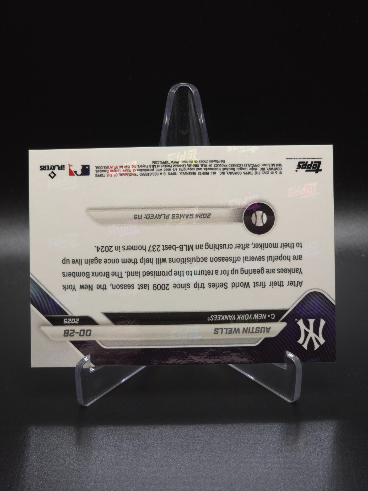 Austin Wells 2025 Topps Now Road To Opening Day New York Yankees Gold #26/50 NOTE: Stand shown in photos not included. Payment: Payment for all purchases is due within 72 hours. For International Buyers: I do not charge duty/taxes/customs fees because I have not control over whether or not your respective country will charge such a fee. As a result, I will not reimburse for assessed duty/taxes/customs fees if charged. Combined Shipping: I do offer combined shipping. In most cases, it will be $0.50/card after the initial main card shipping purchase. If the combined shipping was not available in the shopping cart, I will gladly provide a refund upon shipping preparation. If you placed an order for additional cards before first order shipped, I will add additional cards with combined shipping. What Shipping Pays For: - If Raw Card: Penny Sleeve, Top Loader, Team Bag, Cardboard Shipping Protectors, Painter's Tape, and Bubble Mailer with Shipping Tracking in most cases. - Ask about a cheaper shipping option! - If Graded Card: Team Bag, Cardboard Shipping Protectors, Painter's Tape, and Bubble Mailer with Shipping Tracking in most cases. Shipping Restrictions: Due to incoming shipping restrictions, global shipping will not mail to the following countries: Barbados, French Guiana, French Polynesia, Guadeloupe, Libya, Martinique, New Caledonia, Reunion, Russian Federation, Ukraine, Venezuela.