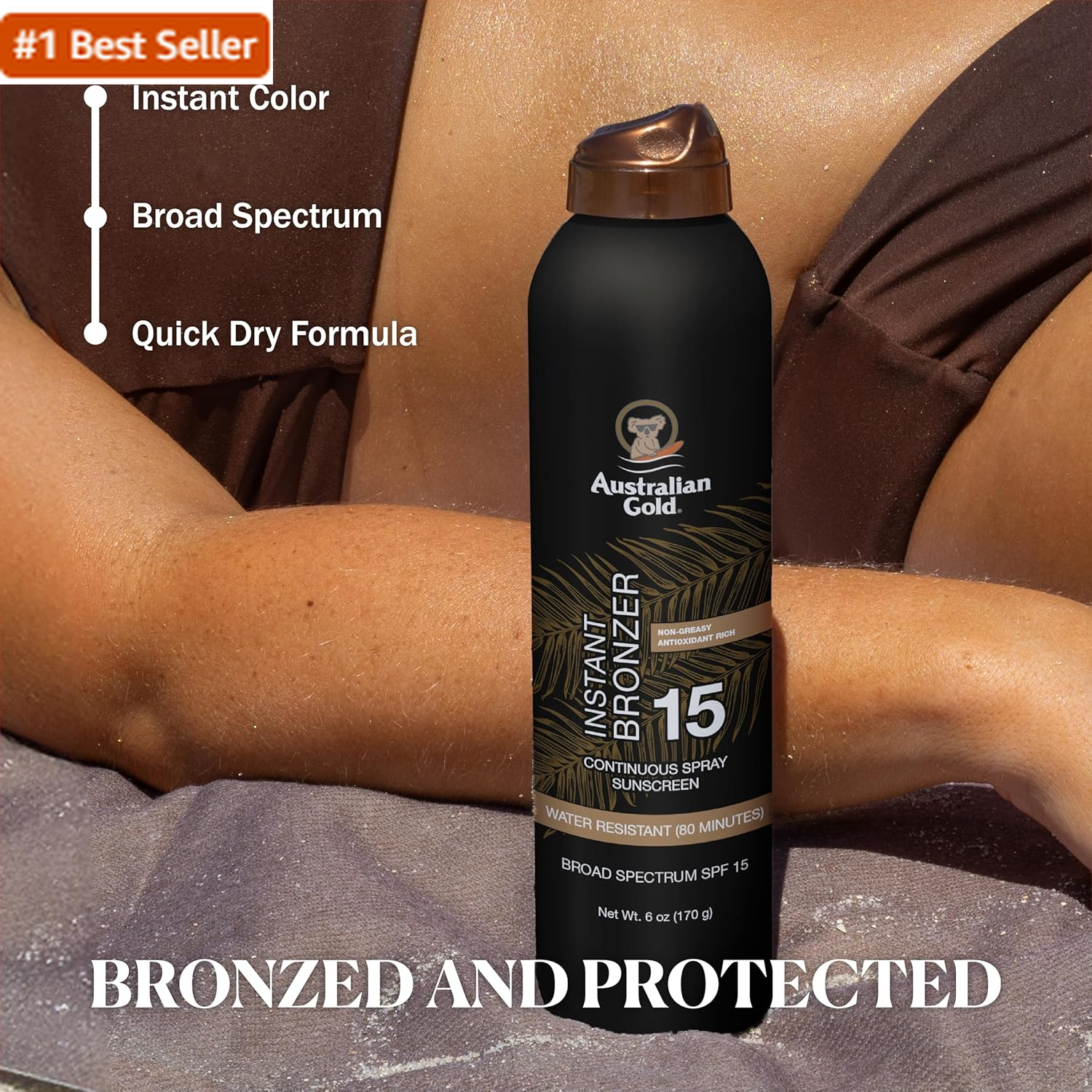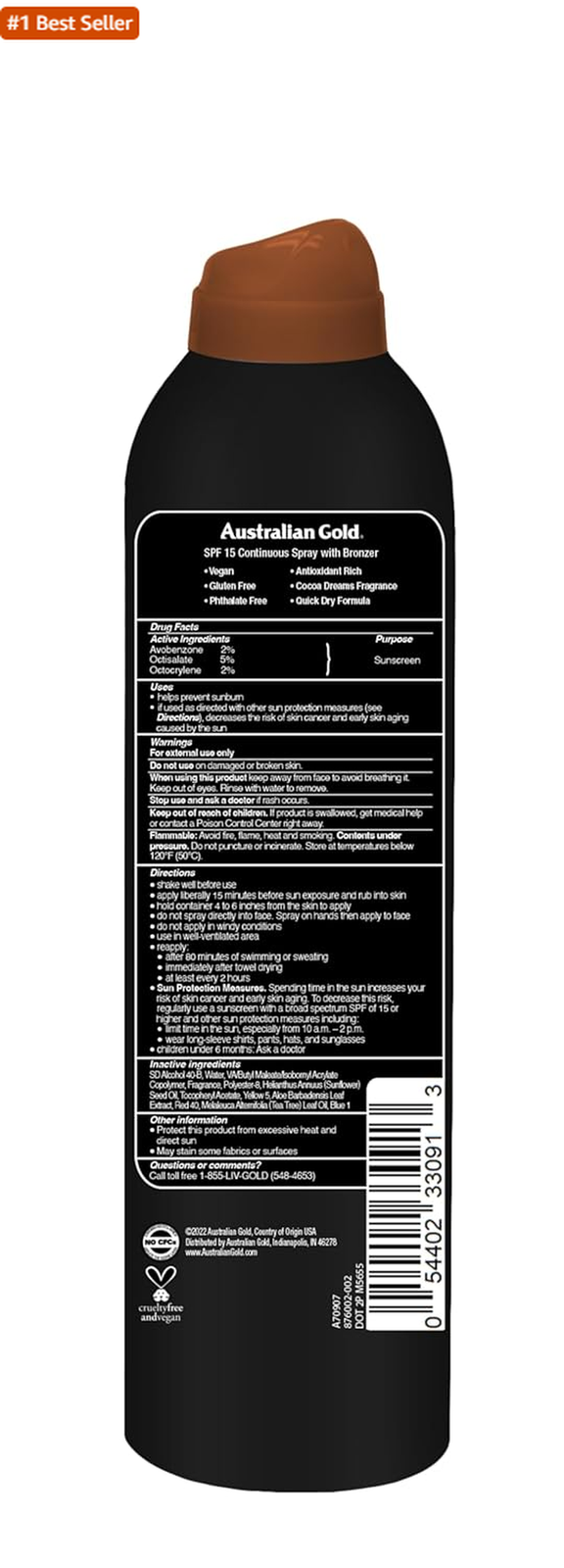 Australian Gold Continuous Spray Sunscreen with Instant Bronzer SPF 15, Immediate Glow & Dries Fast, Broad Spectrum, Water Resistant, Non-Greasy, Oxybenzone Free, Cruelty Free, 6 Ounce SOFT ON SKIN - SPF 15 formula is designed to provide ultimate hydration that deeply moisturizes the skin, and the caramel bronzer imparts a faux sun-kissed golden glow for an instant tinted look BLESSED WITH AUSTRALIAN NATURALS - A rich blend of Kakadu Plum extract with highest content of Vitamin C, and Tea Tree Oil, a powerful antioxidant, fights off free radicals and leaves skin fresh. Comes in a delectable scent of Coconut, Orange, and Vanilla BROAD SPECTRUM SUNBLOCK shields the skin from both UVA and UVB rays and reduces the adverse effects of sunlight. Generously apply this lightweight, non-greasy sheer sun protector and tanning spray before stepping out, or reapply as required QUICK DRY 360 DEGREE PROTECTION - This general protection Continuous Spray with temporary bronzer comes in a spray bottle that is convenient to use, quickly gets absorbed by the skin and dries fast so you remain active at all times SPECIALLY FORMULATED SUNSCREEN - Australian Gold's time-tested formula is designed to be Oxybenzone Free, PABA Free, Phthalate Free, Gluten Free with no CFCs. It is water resistant (up to 80 minutes), purely vegan, cruelty free and never tested on animals B07YZQYBVN Item model number A70907 Style SPF 15 Number of Items 1 Sun Protection Factor 15 Sun Protection Factor (SPF) Product Dimensions 2 x 2 x 7 inches; 6 ounces Country of Origin USA Product Benefits function(f) {var _np=(window.P._namespace("DetailPageProductOverviewTemplatesJava"));if(_np.guardFatal){_np.guardFatal(f)(_np);}else{f(_np);}}(function(P) { P.when('A').execute(function(A){ A.on('a:truncate:po-attribute-truncate-1:updated', function(data) { var isTruncated = !data.truncateInstance.getIfTextFits(); var seeMoreElement = document.getElementById('po-attribute-see-more-id-1'); if(seeMoreElement) { seeMoreElement.style.display = isTruncated ? '' : 'none'; } }) }); })); Promotes collagen production while helping protect from free radicals., Caramel imparts an immediate, temporary golden hue., Antioxidant, Moisturizing See more Item Weight 6 Ounces Scent Orange Size 6 Ounce (Pack of 1) Shipping Fast shipping is very important for us. Our standard US shipping service is FREE. Your order will be shipped within 2-3 business days upon full payment received. Your order will be delivered within 2-3 business days after the handling time. We only ship to the confirmed PayPal address. We reserve the right to cancel any order for any reason at any time. We are not responsible for undeliverable addresses. Returns and payment We offer a 30 days return policy from checkout winning date. We allow only PayPal as payment method FeedBack Your feedback very important to us, after you get your package and you are satisfied with our service please leave us positive feedback If you have any problem with your order / any questions please before leave any type of feedback For any questions, using eBay contact system Please visit our eBay store to check out other items for sale! Thank you for shopping at our store.