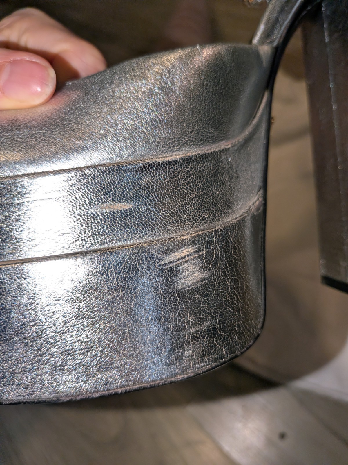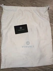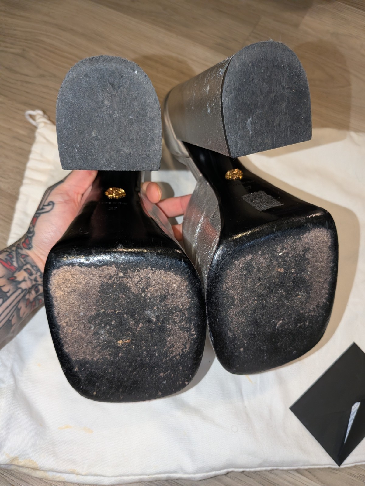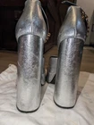 Size 37 fits 37/37.5 (7, 7.5) silver Versace Medusa Aevitas leather heels. High block heel, double platform, gold rhinestone ankle strap, Medusa charm on ankle straps and on the back of the sole. Comes with authenticity card and dust bag. Used--fair condition. They've lived a party life: scratching throughout the heels, silver finish is rubbed off in a few places, worn bottoms. Tried to capture best I could in photos. Note when wearing it's not too noticable thanks to silver finish. - Outer fabric: 100% Lambskin - Lining: 100% Goat Leather - Sole: 100% Calf Leather - Heel Height: 15 cm - All sizes fit Italian standards