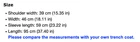 Thank you for visiting our shop. 1. Measure your body size (shoulder width, width, sleeve length, length, etc) using a measurement. 2. Compare the measurements with your own trench coat. Description Item BURBERRY Trench Coat Authentic BURBERRY LONDON Long w/Belt Check Stone Beige 38/S Size Shoulder width: 39 cm (15.35 in) Width: 46 cm (18.11 in) Sleeve length: 59 cm (23.22 in) Length: 95 cm (37.40 in) Please compare the measurements with your own trench coat. Condition Excellent condition. No noticeable scratches or stains ※ The color and condition of the item is our subjective judgment. Included Items Belt ※No other accessory items included(e.g., coat cover, shopping bag, etc) Material Main Fabric: 64% polyester, 36% cotton Main Lining: 100% cotton Sleeve Lining: 100% cupro Shipping We send the item from Japan with a tracking number. So please place an order without any concern on delivery. You can always track the delivery status. Shipping is only available to the address registered in eBay. If you want us to send another address, please change your address on eBay and then place an order. Shipping is available from Monday to Friday. Weekends are not available because freight (shipping) companies are closed. We do not mark merchandise values below value or mark items as “gifts” – Japan, US and International government regulations prohibit such behavior. About Importer's Obligation Import duties, taxes, and charges are not included in the item price or shipping cost. These charges are the buyer's responsibility. Please check with your country's customs office to determine what these additional costs will be prior to bidding or buying. Policy Payment You can use various payment methods based on eBay Managed Payments. Import duties, taxes and charges are not included in the item price or shipping charges. These charges are the buyer's responsibility. Cancellations & Returns Cancellation or returns will be accepted only if the item has an obvious problem that was not mentioned in the listing description. If that, please let us know within 3 days you got the item. Buyer is responsible for shipping costs and any charge incurred shipping products back. Thank you for your understanding.