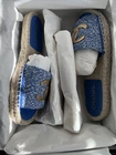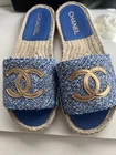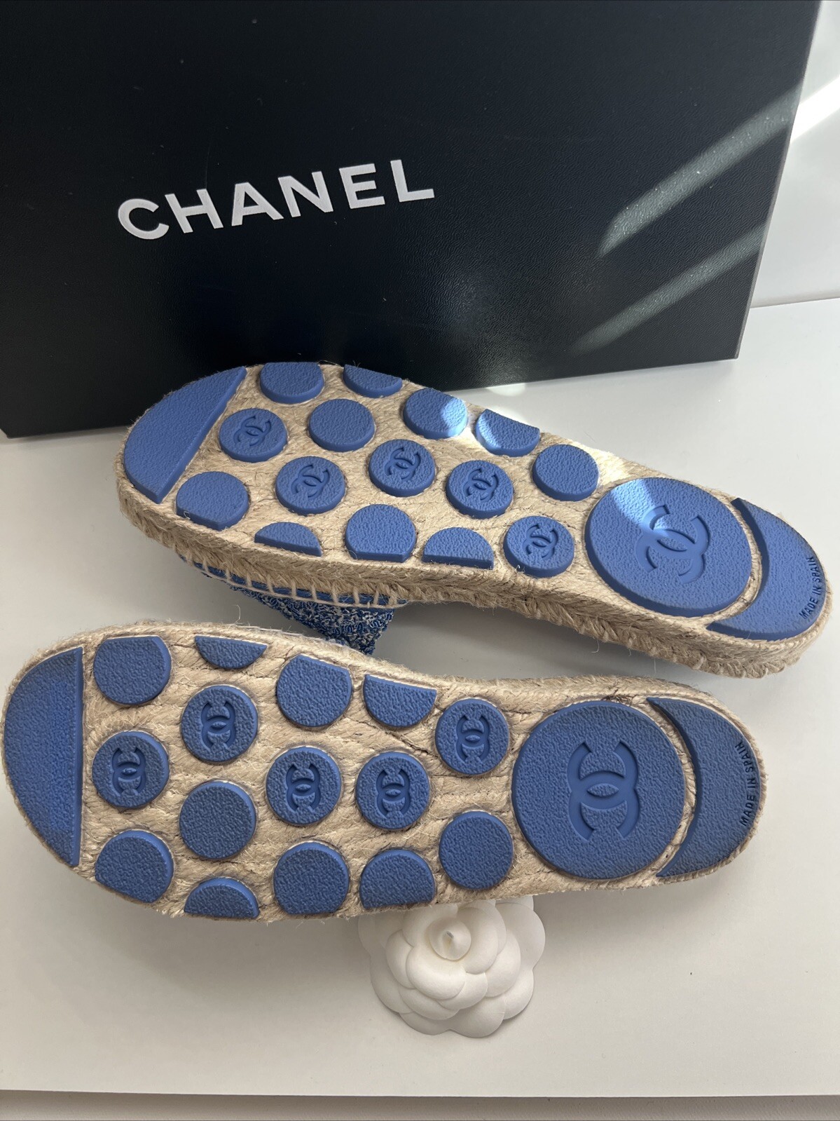 These Authentic Chanel 24P Blue and Gold CC Logo Slide Sandals are a stylish and luxurious addition to any woman's shoe collection. With a slip-on and flat height, they offer comfort and ease for casual occasions during the summer and spring seasons. The Gold signature Chanel logo accents add a touch of elegance to the blue tweed espadrille material while the leather and raffia insole provides a plush and durable experience. Perfect for adding a touch of chic and sophistication to any outfit, these sandals are a must-have for any fashion-forward woman. Size 37. New in box, authentic guaranteed!