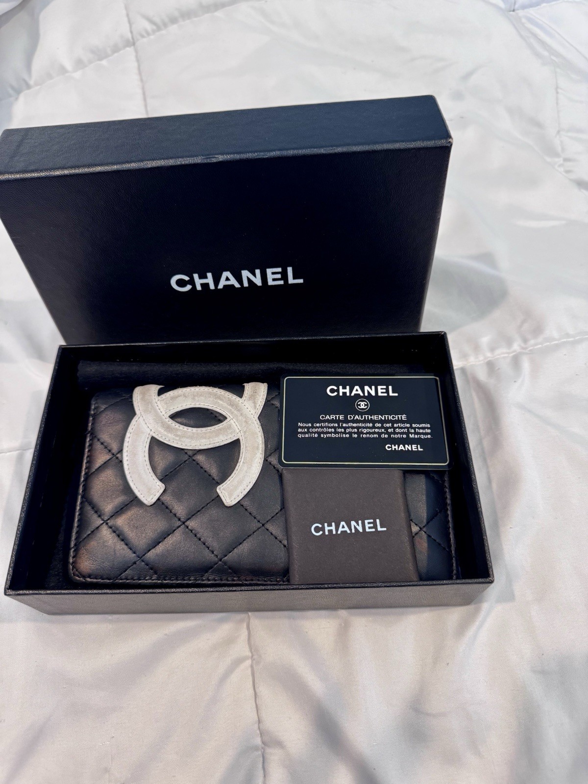 π€ Authentic Chanel Cambon Ligne Long Black Quilted Wallet π€ Elevate your everyday essentials with this stunning Chanel Cambon Ligne Long Wallet in classic black quilted leather. Featuring the signature CC logo in white leather, this wallet is the perfect blend of luxury and function. β¨ Details: Brand: Chanel Style: Cambon Ligne Long Wallet Color: Black with White CC Logo Material: Lambskin leather Interior: Multiple card slots, bill compartments, zip coin pocket Size: Approx. 7.5β x 4β Closure: Snap button Made in: Italy Serial number present in last picture π Condition: Gently used. Minor signs of wear on corners and inside lining, consistent with normal use. No rips or tears. Leather is soft and supple. π Comes from a smoke-free home. 100% authentic β buy with confidence! π Feel free to message me with any questions or to request more photos.