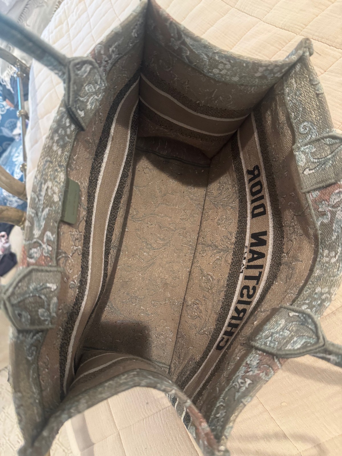 The Christian Dior Book Tote, in its medium size and Brocante Embroidery Special Edition, offers a unique and elegant twist on a Dior classic . Design: Introduced by Maria Grazia Chiuri, the Book Tote is a spacious carryall known for its minimalist yet sophisticated design. The "Brocante Embroidery Special Edition" refers to a specific, unique embroidery pattern or motif, perhaps drawing inspiration from antique or vintage textiles, that distinguishes it from other Book Tote designs. Embroidery: The Book Tote is renowned for its intricate embroidery. The Brocante edition would feature a special embroidery design that may incorporate elements like: Specific patterns: Like Toile de Jouy or other decorative patterns, but with a unique twist or color scheme. Unique color combinations: incorporating muted, earthy tones, or a blend of colors that evoke a vintage aesthetic, typical of a "brocante" theme. Special motifs: showcasing specific objects or scenes commonly found in antique markets or flea markets. Materials: The medium Dior Book Tote typically features a cotton canvas base, with the Brocante embroidery meticulously crafted onto it. Dimensions: The medium Dior Book Tote measures approximately 36 x 27.5 x 16.5 cm (14 x 11 x 6.5 inches). This size can comfortably accommodate daily essentials, including a 15-inch laptop, a wallet, a phone, and cosmetics. Craftsmanship: The embroidery of a Book Tote, particularly special editions, involves meticulous work and a high number of stitches to create the intricate pattern and relief effect. "Christian Dior Paris" Signature: The tote will feature the prominent "Christian Dior Paris" signature on the front, a hallmark of the House.