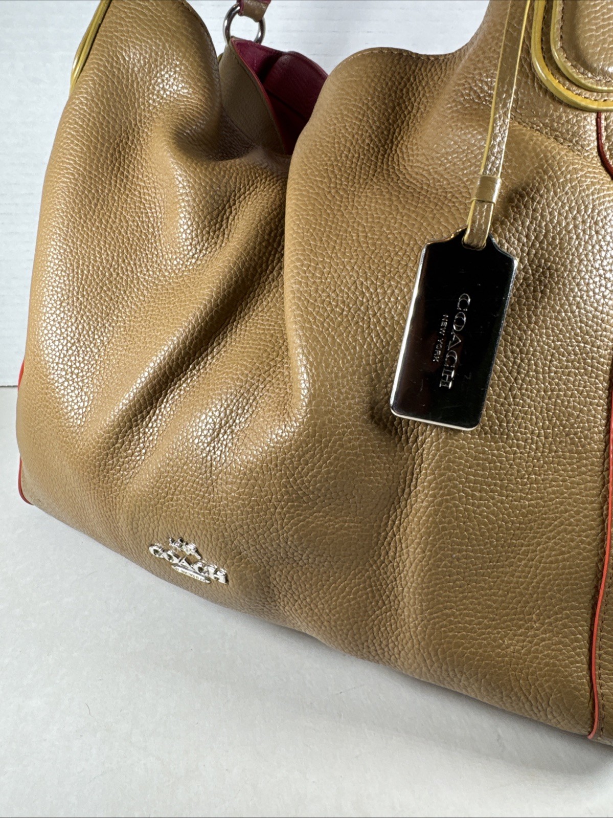 The Authentic Coach Edie 31 Edgestain Beige & Pink Shoulder Bag with Turn-lock 3 Compartment is a stylish and versatile accessory for women. This large rectangle-shaped bag features a classic pebbled leather exterior in beige color with pink accents, making it perfect for casual or business occasions. The bag has a zip and magnetic closure, double handles in beige and pink, and silver hardware accents. It comes with a bag charm and lock, adding a touch of luxury to the designer piece from the Coach Edie 31 collection. A great addition to any wardrobe for those who appreciate classic and timeless style.