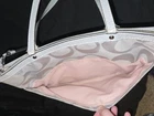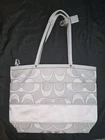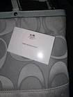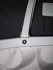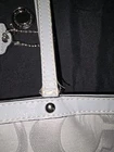 The Authentic Coach Signature Gray Silver Monogrammed Bag is a stylish and versatile accessory for women. Made with a gray canvas exterior and silver accents, this medium-sized bag features a monogram pattern and a zip closure for a secure fit. The shoulder strap handle adds a convenient touch, making it easy to carry on the go. This designer bag by Coach is perfect for adding a touch of luxury to any outfit, with its elegant hardware and recognizable monogram detail. The bag is in used condition, some wear and tear on it. Needs a good wash. Do not use anymore. Has the care instructions pamphlet that it came with. Bag charm still attached. See images before buying it is sold as is. Needs to be repaired on parts of handle. see images. **Sold as is***