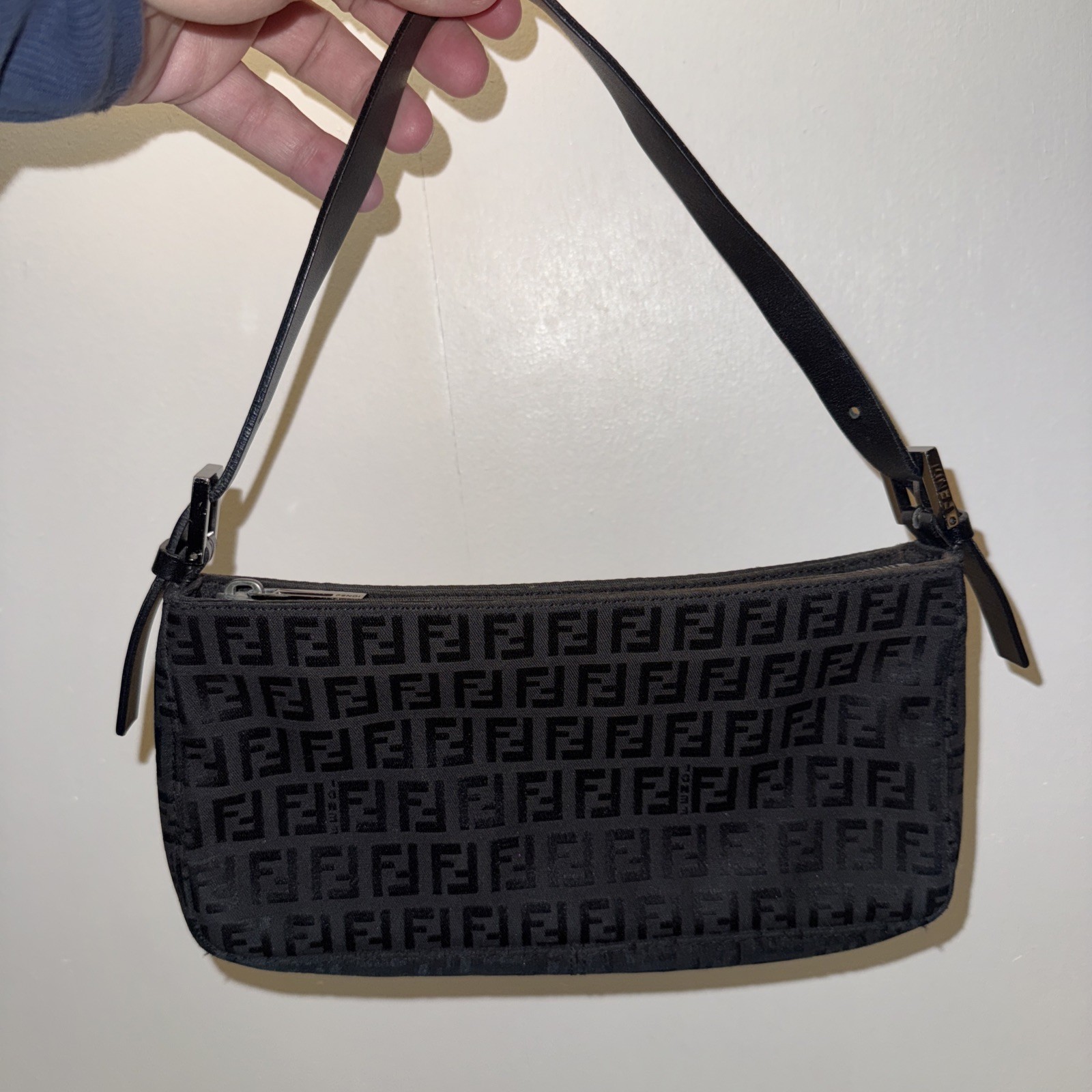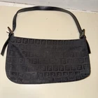 The AUTH FENDI Black Zucchino Monogram Pochette Small Shoulder Bag is a stylish and luxurious accessory for women. Made from durable canvas material with a classic monogram pattern, this small shoulder bag features a zip closure and a sleek black handle. It is designed by the renowned brand Fendi in Italy, making it a sophisticated addition to any outfit. * used and good to very good condition Some scratches and makeup stains inside bag which brings character to this vintage bag. Fendi Fabric both sides outside are in near perfect condition. All that matters Handle strap near perfect also. Zipper works perfectly Check pictures - all sales are final