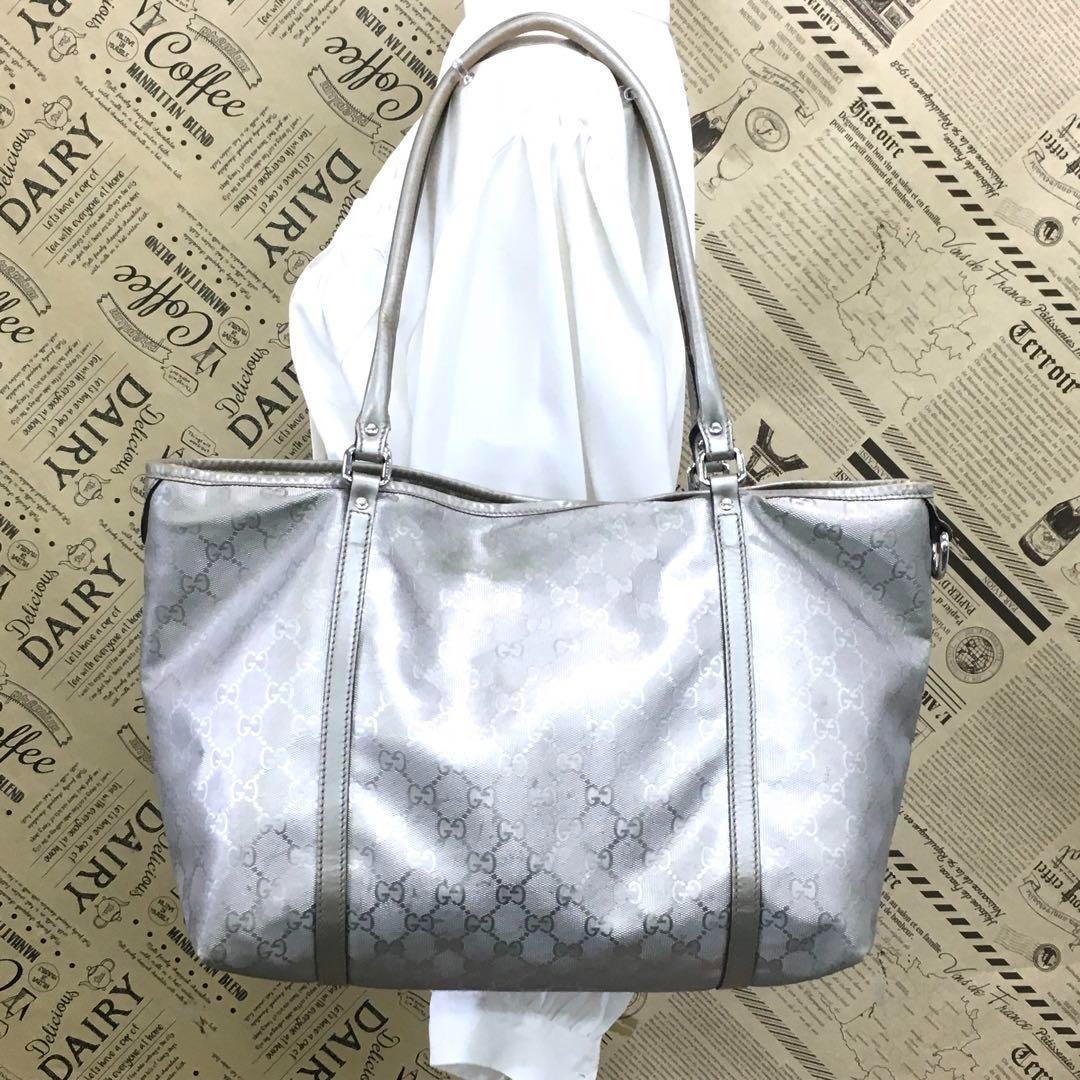 Authentic GUCCI GG Imprime PVC Leather Tote Bag silver New Jackie Description Product Description Height: approx. 25 cm Width: approx. 45 cm Thickness: approx. 15 cm Handle: approx. 60 cm Pocket: 1 pocket Color: Silver Material: PVC Engraving, serial, etc.: 197953213312 Attachment: None (main body only) [Item Details. There is a sense of use overall. The zipper opens and closes smoothly. There are no problems with the fastening of the hooks. The material is not sticky. There are stains and spots on the inside. There are scuffs and peeling on the outside corners. There are scuffs on the surface. The handle is broken. Although there are some of the above damages, this item can be used for daily use without any problems. Shipping We send a product by DHL or FedEx or Japan Post (EMS/Small Packet/Air Mail). We ship with basically fast FedEx or DHL. Shipping is only available to the address registered in eBay. Please note that any address not registered in eBay is not acceptable to ship. Shipping is available from Monday to Friday.Weekends are not available because post office is closed. Thank you for your understanding. To our customers Thank you for bidding and shopping with us! Products are expensive, much less second-hand or from overseas, and you may be hesitant to purchase from us. Therefore, we will make a sincere effort to provide the highest standard of customer service and give you peace of mind.If you have any questions, please do not hesitate to contact us. International Buyers - Please Note: Payment We will ship the item 10 business days after your payment clears. Please note that we also sell our products on other websites, so please be aware that we are out of stock. Customs fee, Import duties, taxes, and charges are not included in the item price or shipping cost. These charges are the buyer's respon. Thank you for your understanding.