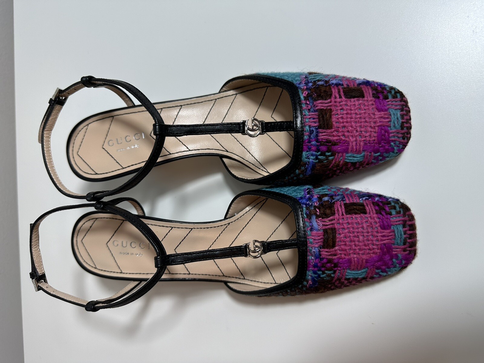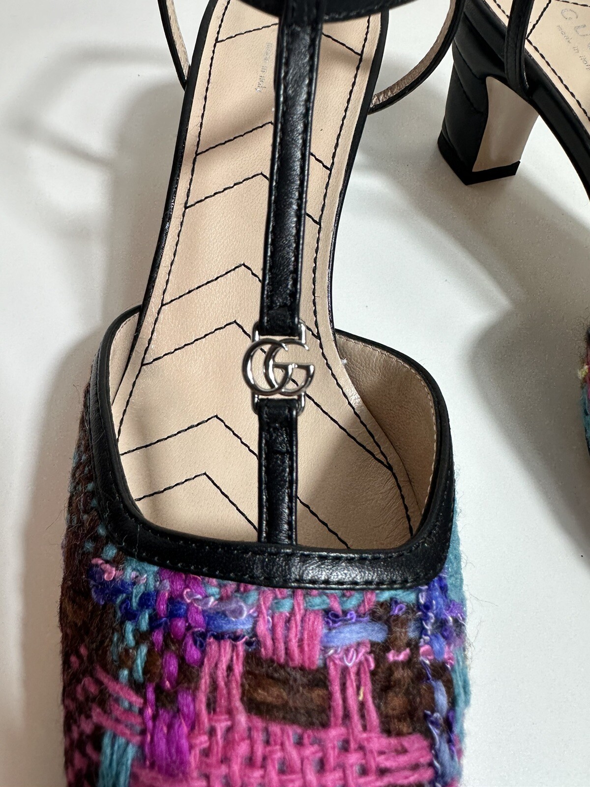 Authentic Gucci Marmont pumps. Multicolor tweed upper in shades of pink, blue, brown, and gold. Designed with a black leather T-strap and mid-height block heel. Finished with signature GG hardware at the toe. Brand : Gucci Model : Marmont 55mm T-Strap Pump Color : Pink multicolor tweed / Black leather Size : EU 39.5 (US 9.5 Women’s) Heel Height : Approx. 55mm (2.2 inches) Material : Tweed and leather upper, leather sole Details : Pointed toe, GG hardware, quilted block heel Condition : Brand new, unworn Authenticity : Guaranteed 100% Authentic Made in : Italy Retail: $980.00.
