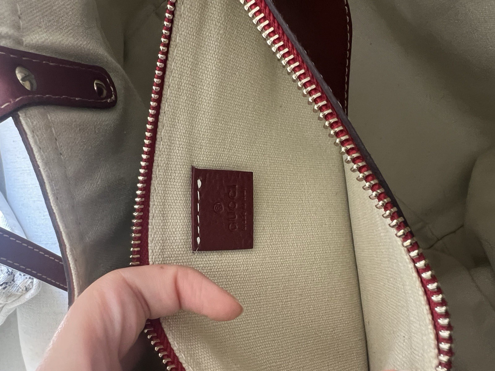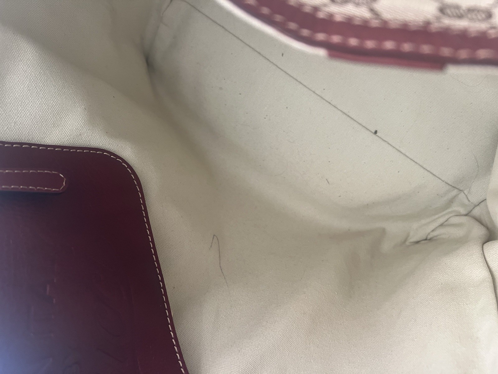 This gorgeous tote is even better in person! The canvas is flawless, and the red pouch is such a chic bonus. The tiny interior mark is barely noticeable. Amazing value—snap it up before it's gone!