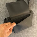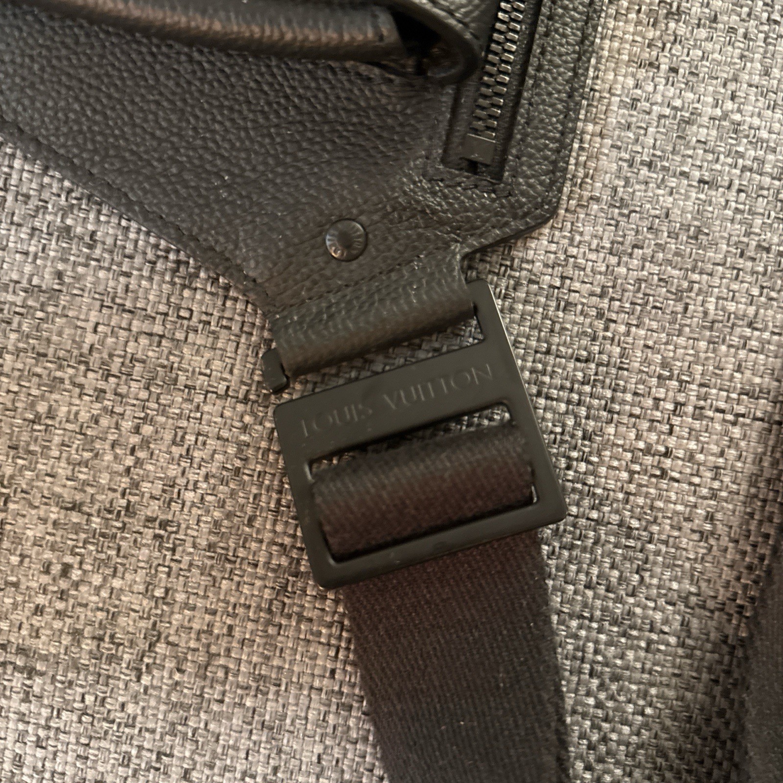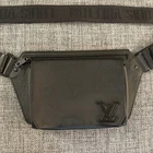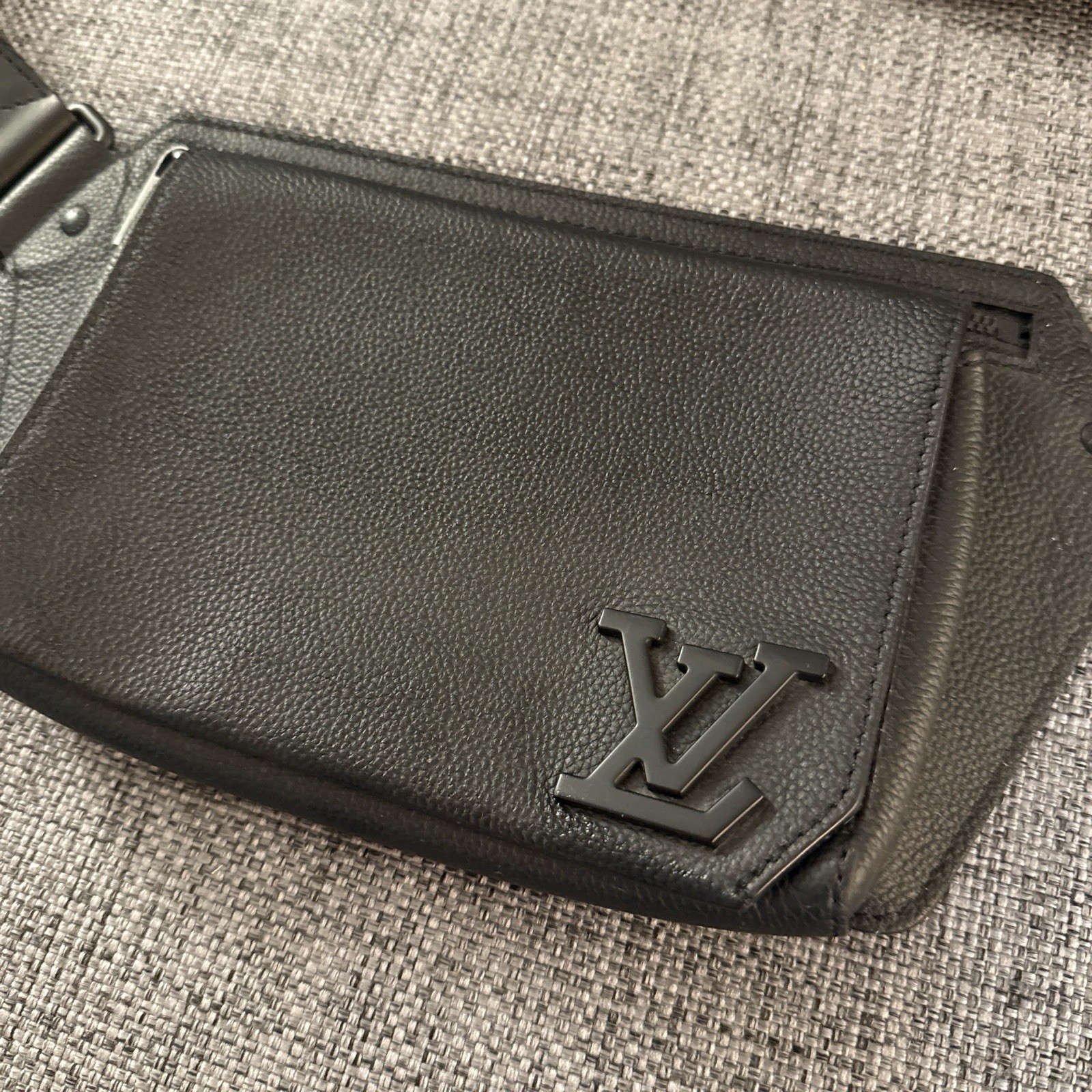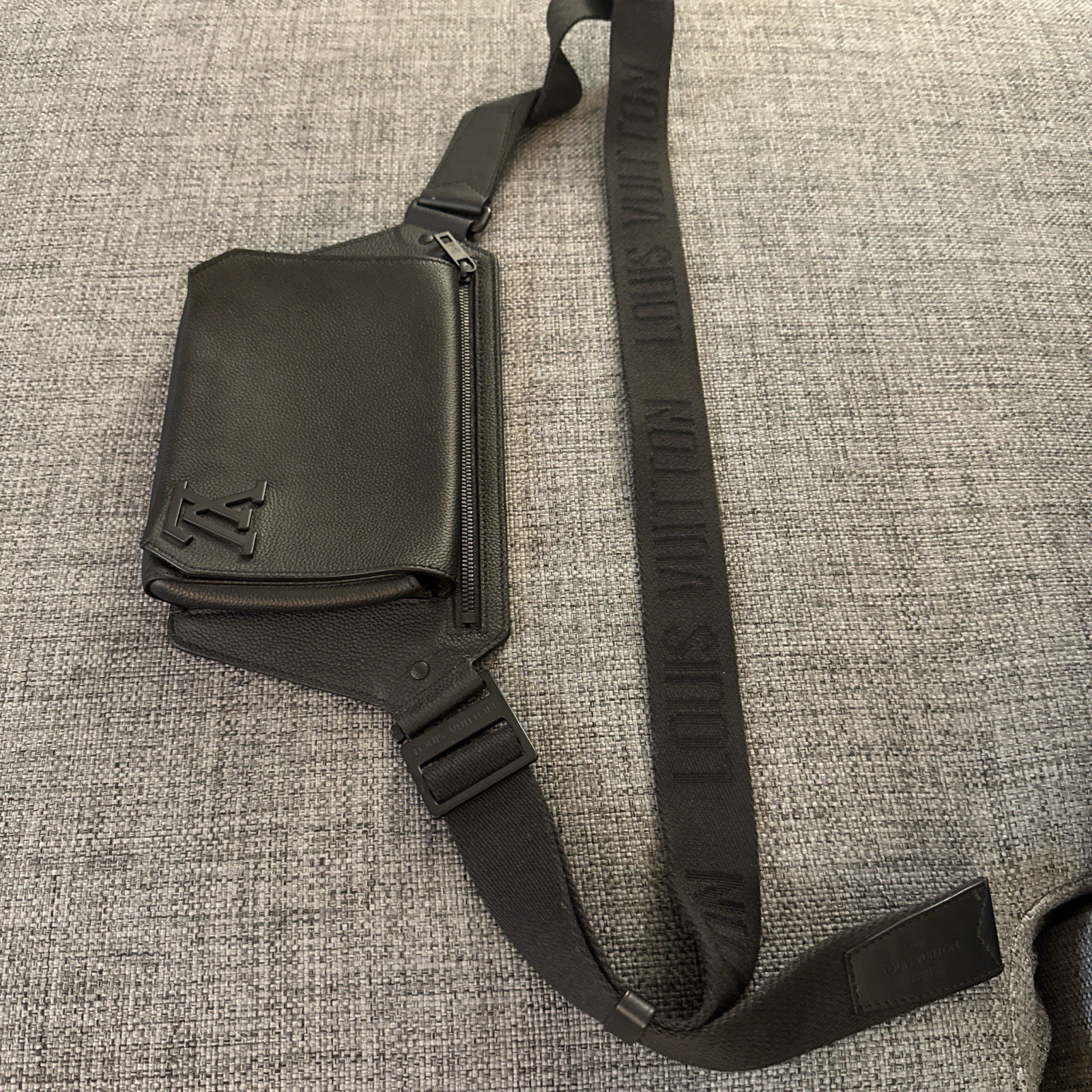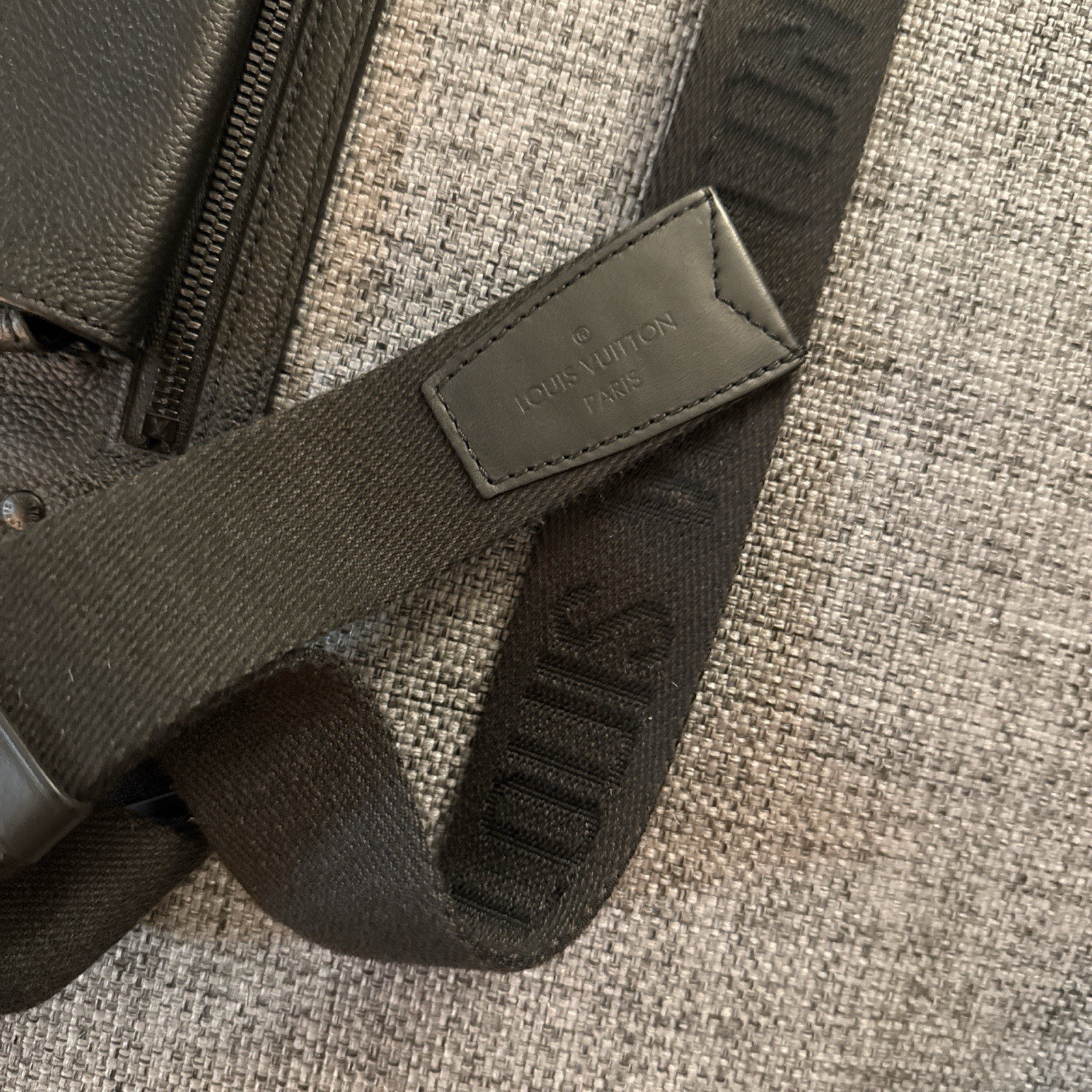 Elevate your streetwear or travel look with this genuine Louis Vuitton District Sling Bag in sleek black grained leather. Featuring the iconic LV monogram embossed in matching black on the front, this modern and versatile piece can be worn crossbody or around the waist. Good as new and very masculine looking