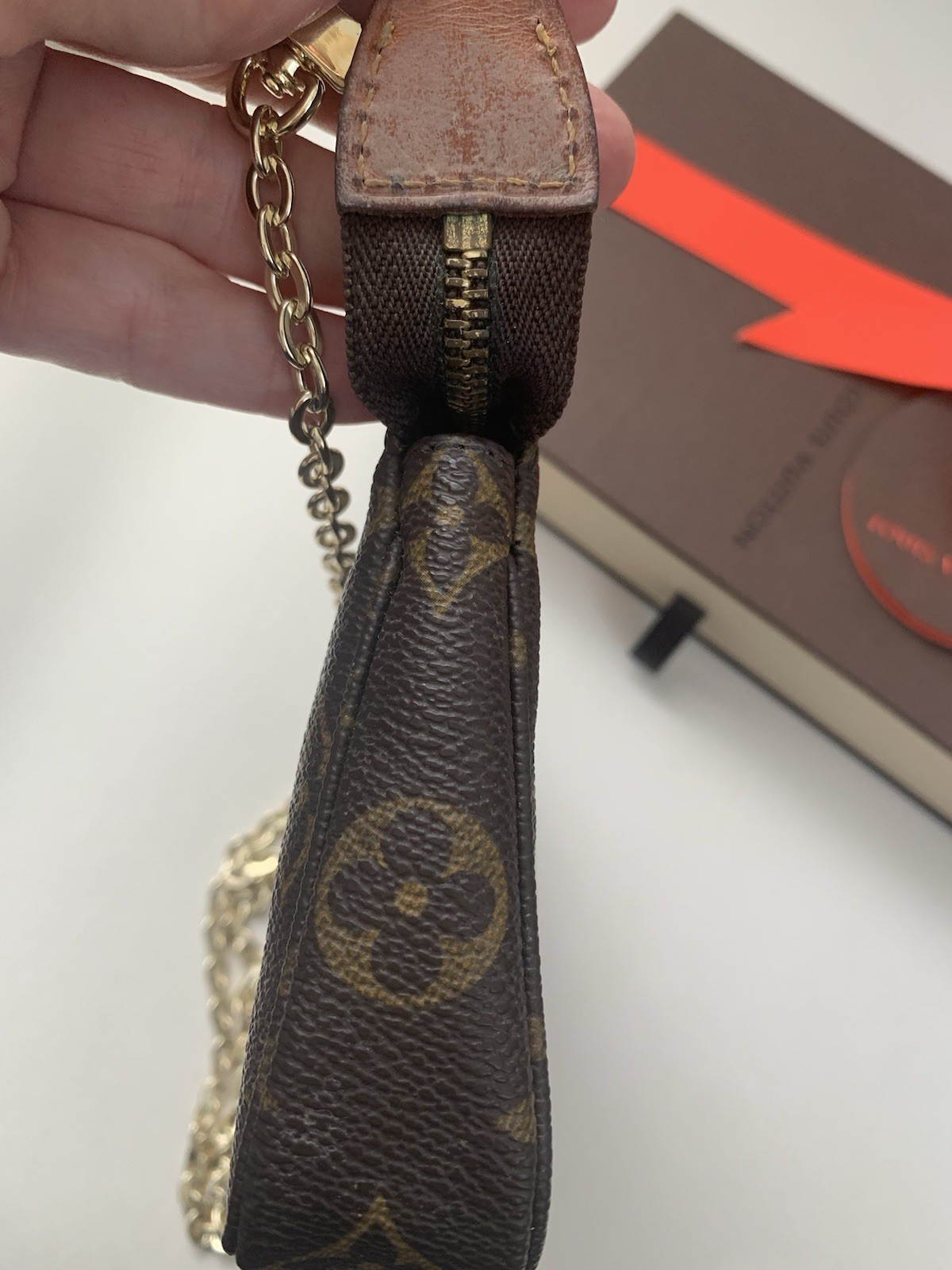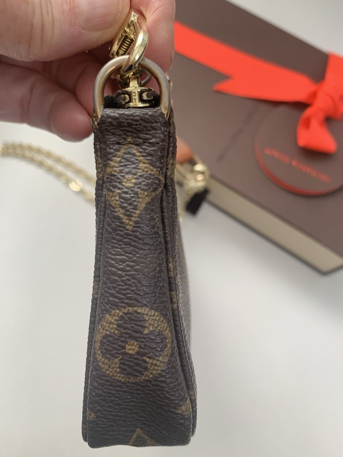 LOUIS VUITTON BABY POUCHETTE AUTHENTIC, CERTIFICATE OF AUTHENTICITY GOOD CONDITION, A FEW LIGHT MARKS ON CANVUS AND A FEW IN THE INSIDE OF BAG. THIS IS PRELOVED, CAN FIT CELL PHONE AND A COUPLE PIECES OF MAKEUP, CARD HOLDER. COMES WITH AUTHENTIC LOUIS VUITTON BOX. I ADDED A NON BRANDED CHAIN LEATHER AND CANVUS 8LX6WX2H