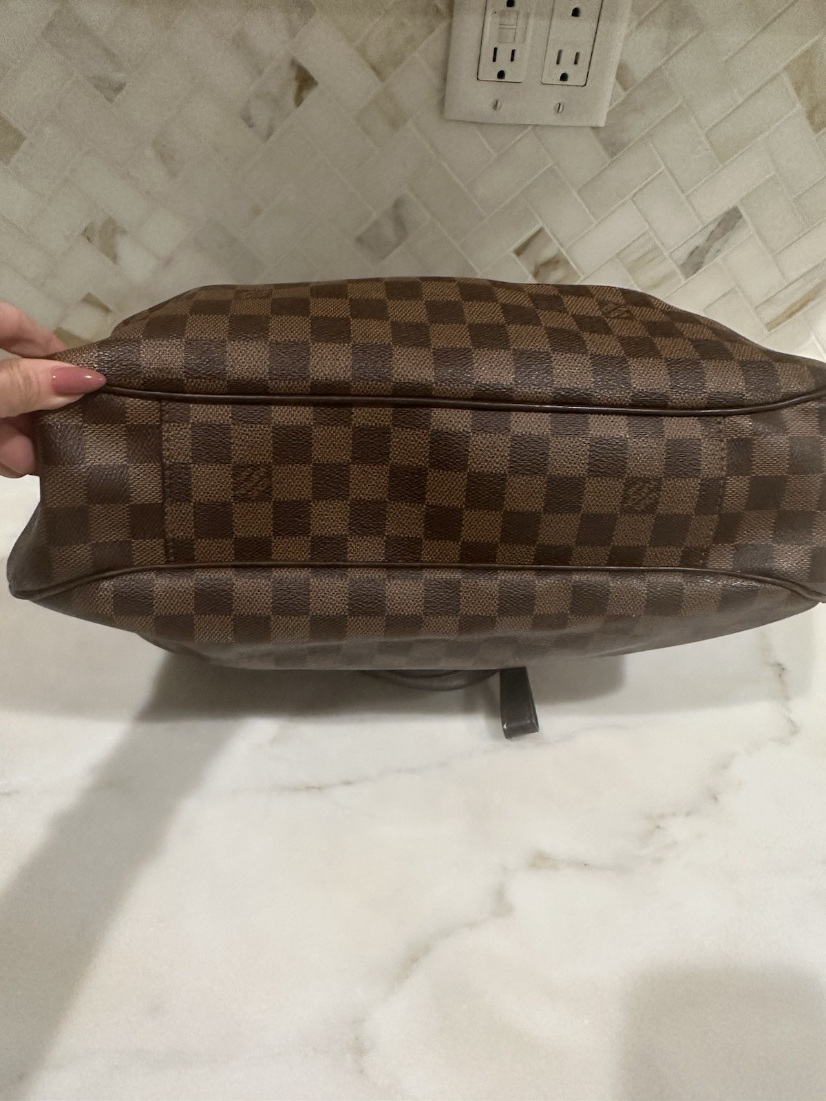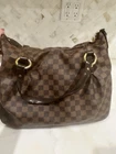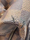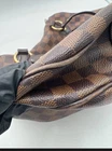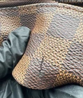 The Authentic Louis Vuitton Damier Ebene Evora MM Crossbody Shoulder Bag Tote is a large-sized canvas bag with the signature Louis Vuitton Damier Ebene pattern. It features a zip closure, gold hardware accents, and a red suede lining. This stylish top handle bag includes a detachable brown leather strap for added versatility. Made in France, this luxury bag exudes elegance and sophistication, making it a must-have accessory for any fashion-forward woman. There’s some signs of wear all pictured.