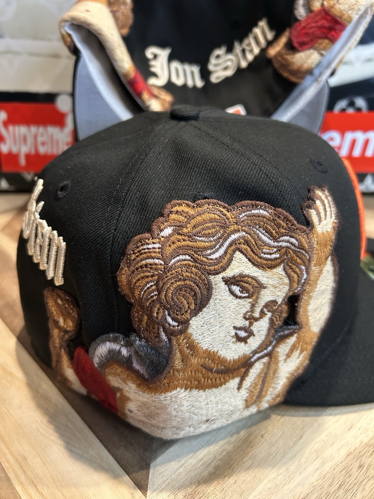 The product is an authentic New Era Jon Stan NYC Baltimore Orioles Angels fitted baseball cap in size 7 3/8. This rare grail cap features a solid black color with various themed concepts such as Kith, Supreme, and Bodega, making it a unique addition to any casual outfit. Made of polyester fabric, this cap is perfect for the summer, fall, or spring seasons and is a must-have for any collector of limited edition baseball caps. Representing iconic MLB teams like the Baltimore Orioles and Los Angeles Angels, this cap is a stylish and versatile accessory for men.