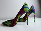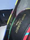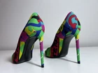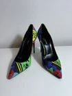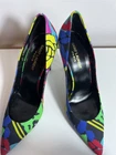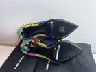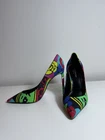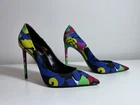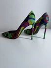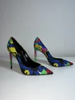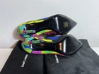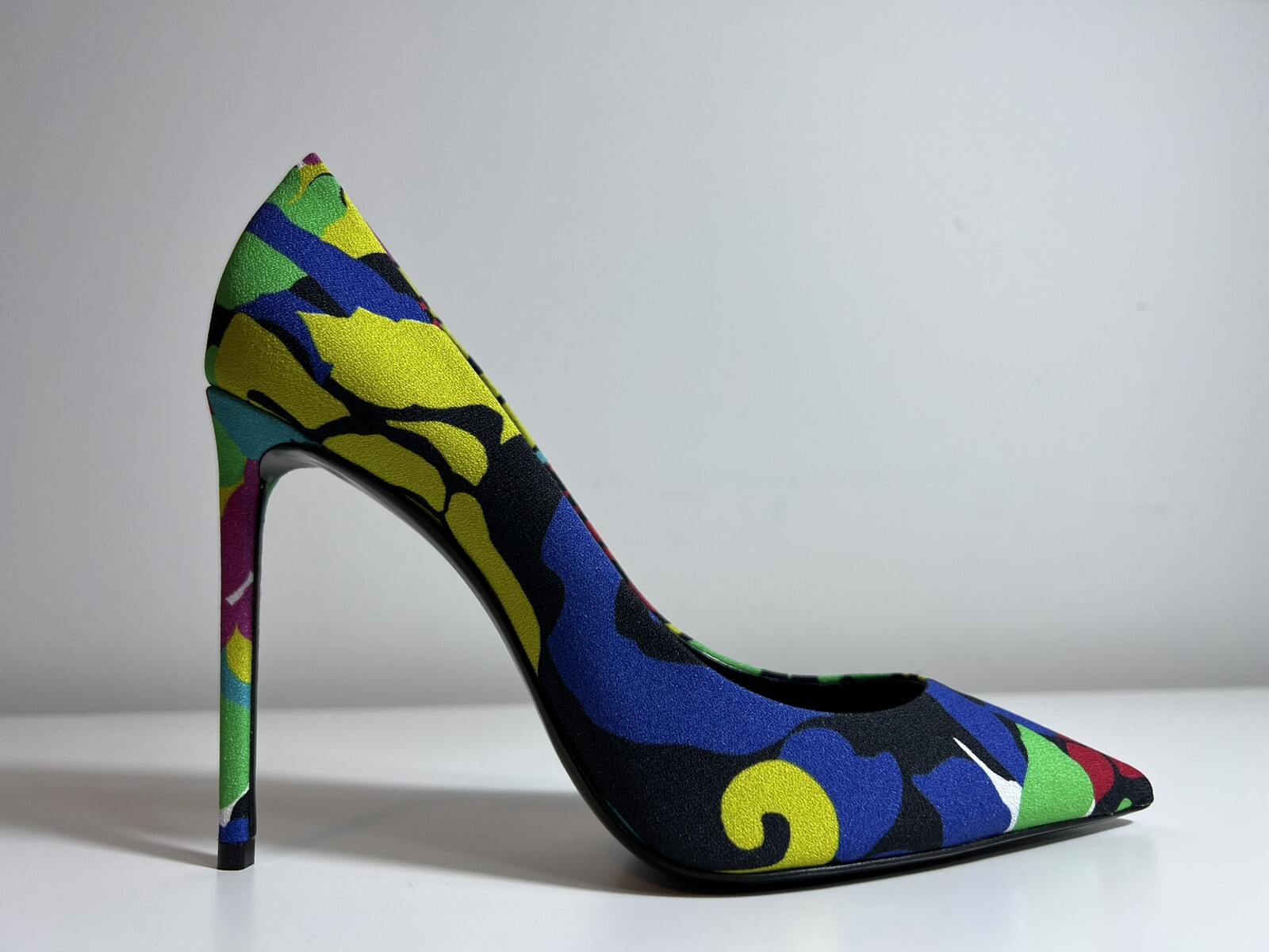 Authentic Saint Laurent Paris Zoe pointed-toe stiletto heels in a multicolor abstract print. Made in Italy. High stiletto heel and a sharp toe finished in vibrant textile fabric. Comes complete with original box, dust bags, and card. Brand : Saint Laurent Paris Model : Zoe Stiletto Pump Color : Multicolor (red, green, blue, yellow, black) Size : EU 39 (US 9) - note that YSL generally runs small. Heel Height : Approx. 4.1 in (10.5 cm) Material : Textile upper, leather insole and sole Condition : Brand new with box, dust bags, and authenticity card Authenticity : 100% Authentic Guaranteed Made in : Italy