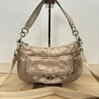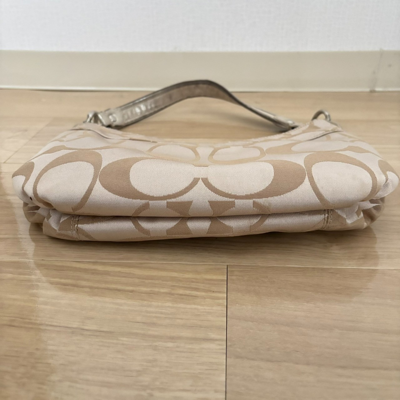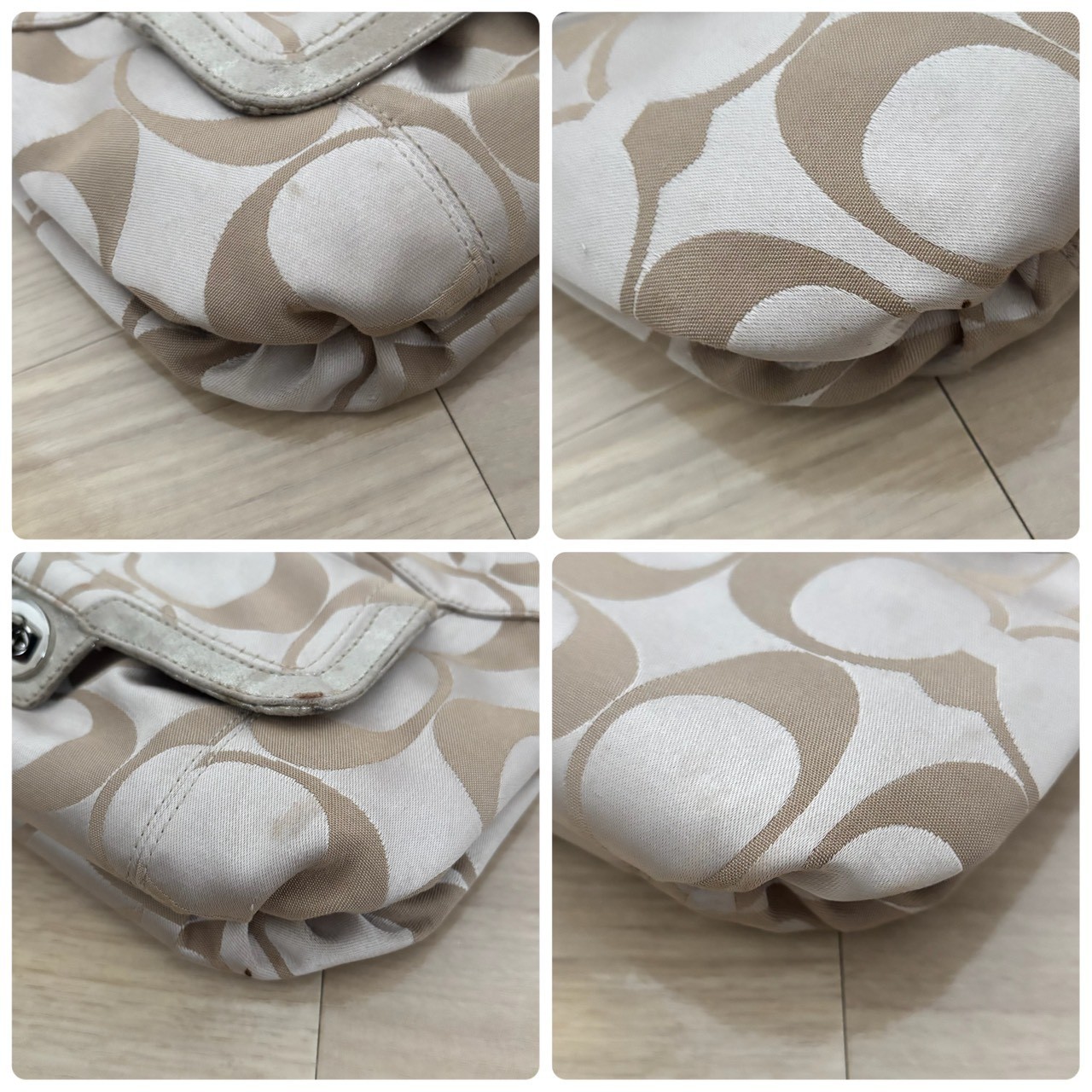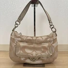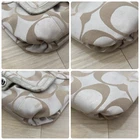 W30cm (11.81 in) H17cm (6.69 in) D4cm (1.57 in) handle40cm (15.75 in) shoulder 110cm (43.31 in) This authentic Coach bag is a rare vintage find from the turn of the century, crafted from durable nylon material with a beige exterior and silver hardware accents. The medium-sized shoulder bag features a classic logo pattern, zip closure, and adjustable beige nylon shoulder strap, making it perfect for casual occasions. Complete with a signature Coach logo charm, this timeless piece exudes both style and quality craftsmanship that is synonymous with the brand's heritage. Perfect for any fashion-forward woman looking to add a touch of luxury to her wardrobe.