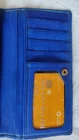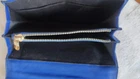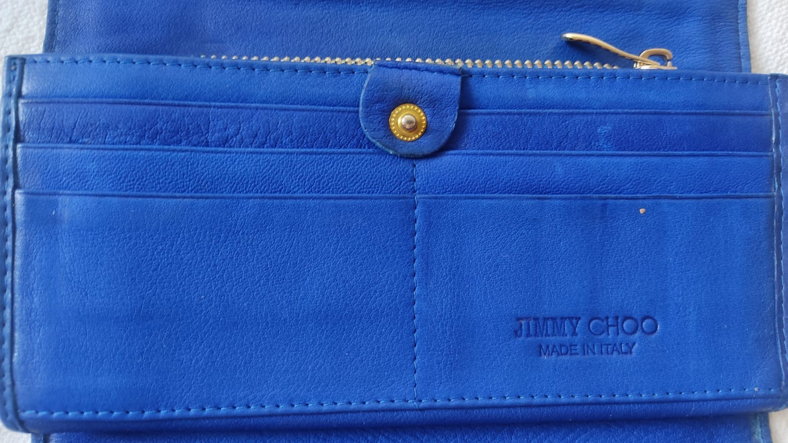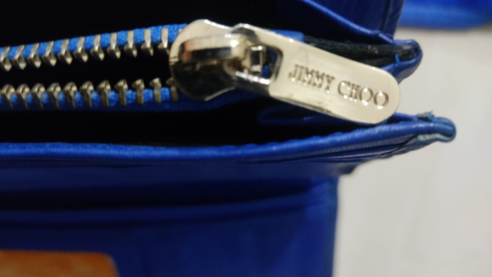 This authentic and rare Jimmy Choo long wallet in blue leather from Italy features a solid pattern with a velvet fabric type. The wallet is a size medium with accents of the Jimmy Choo logo, making it a stylish clutch for both men and women. Measuring 7.5 inches in length and 4 inches in width, this luxurious accessory is a unique and practical addition to any wardrobe.