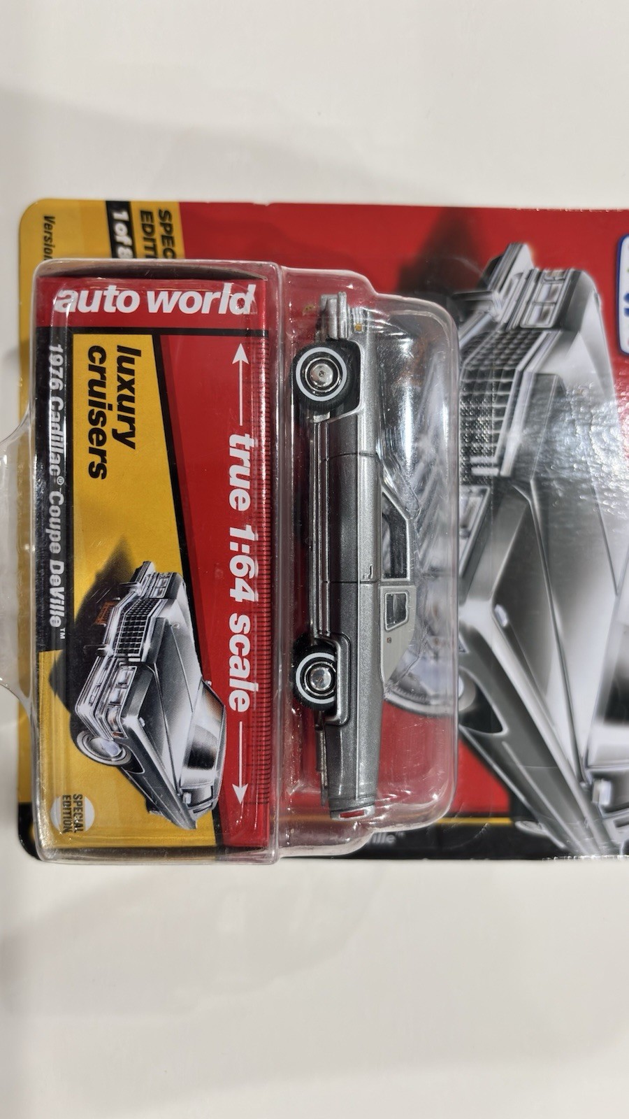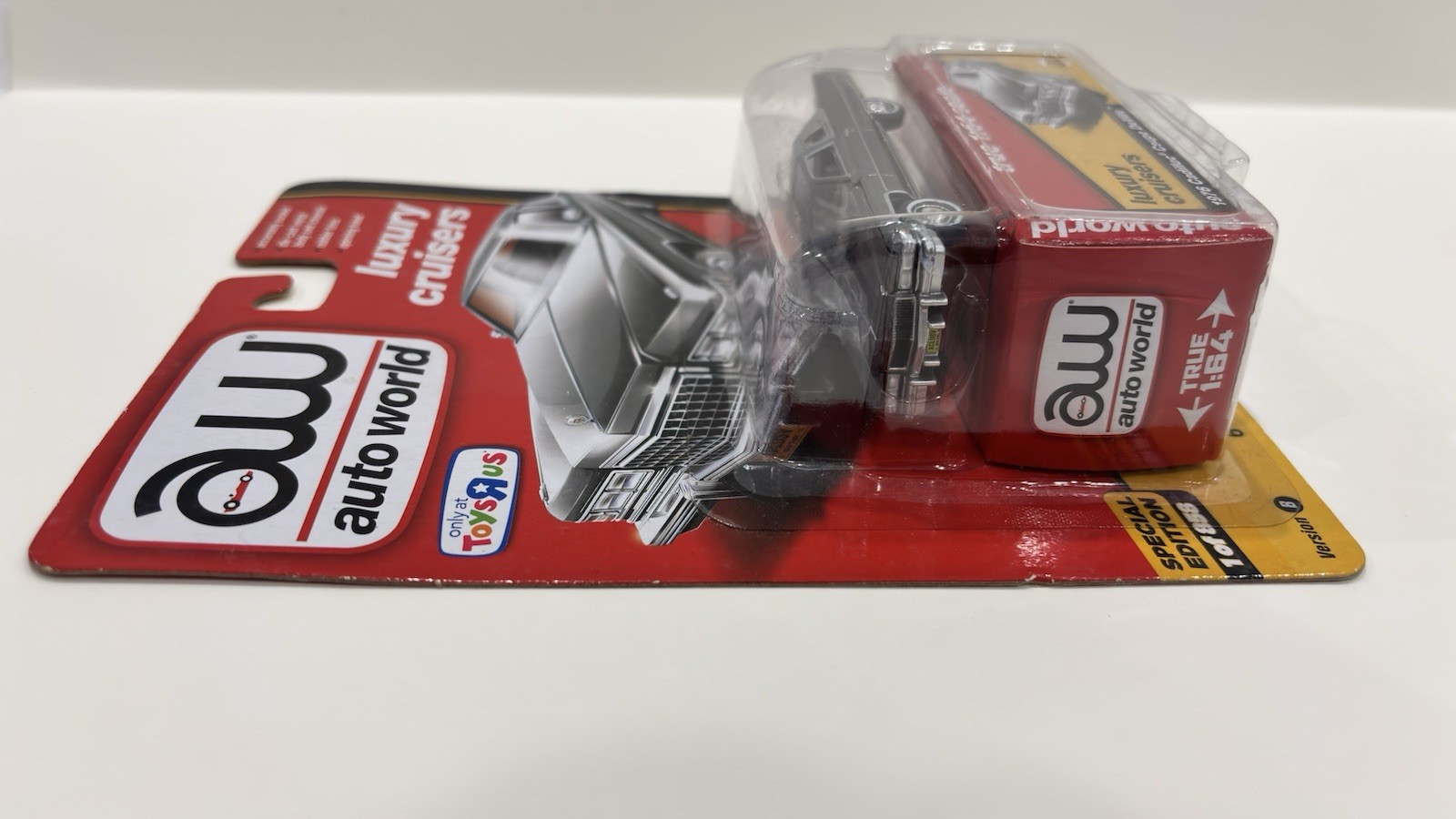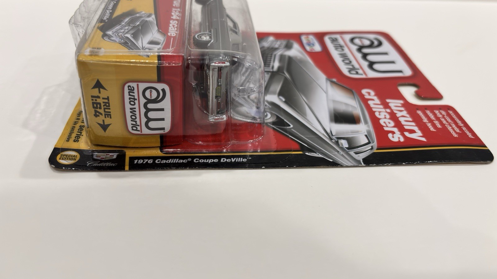 Auto World Luxury Cruisers 1976 Cadillac Coupe DeVille (1:64 scale). Only at Toys R Us special edition. Packaging has small nicks along the cardboard edges, but the car itself is in excellent condition and has never been removed from the package.